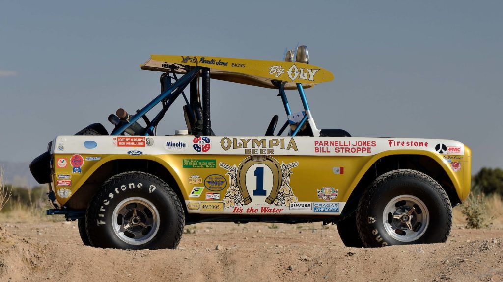 The 1969 Ford Bronco ‘BIG OLY from Mecum Auctions is based on a 1969 Bronco and has sponsorship in place from Olympia Brewing Company. Big Oly is among the most memorable in the history of motorsports and it was driven by the iconic Parnelli Jones, a man who, without doubt, enjoyed pet names for his racing vehicles. Jones was made famous driving a car named “Ol’ Calhoun,” his faithful Watson-Offenhauser racer in which he broke the elusive 150 MPH barrier and won the Indianapolis 500.