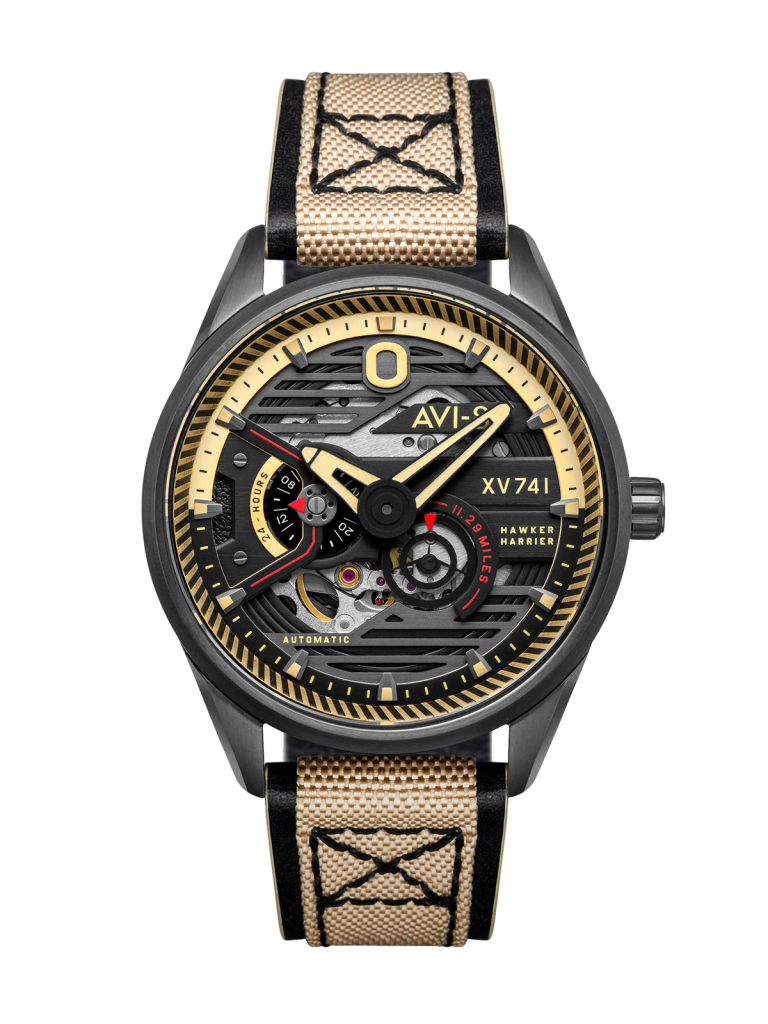 Contemporary aviation design and flair is supported by a precise and ever-reliable Japanese automatic movement. Under the hood, this watch is powered by a modified 21 jewel, 21,600 vph, Miyota 8 series automatic movement. A custom self-winding rotor has been integrated into the design to reflect the Harrier’s distinguished Rolls Royce Pegasus engine.