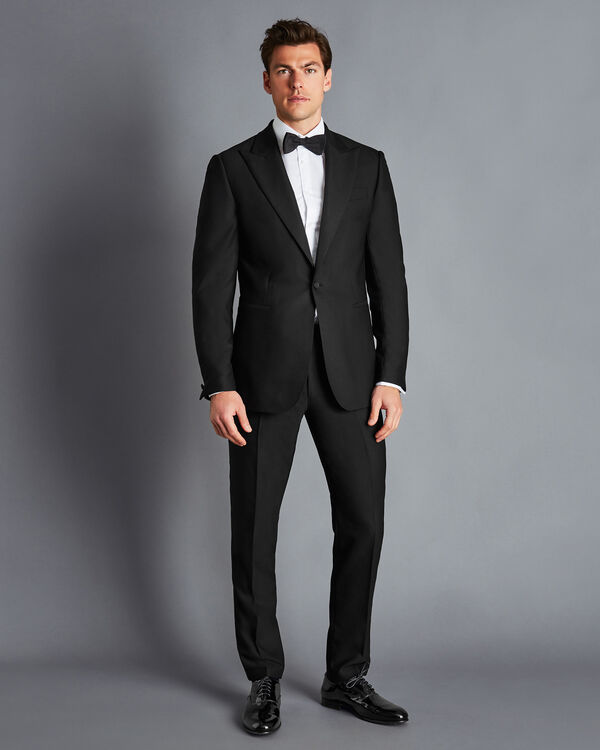 This black Peak Lapel Dinner Suit from Charles Tyrwhitt is a timeless and elegant choice for any formal occasion. The suit is made from a fine wool blend that is both comfortable and stylish, and the peak lapels add a touch of sophistication. The suit also features a single button closure, two front pockets, and a ticket pocket on the left breast. It comes with a matching waistcoat and trousers.