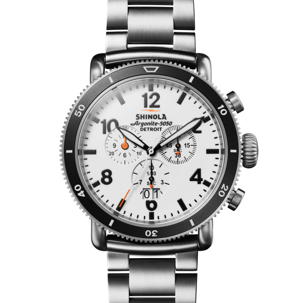 Precision matters. Inspired by the Great Lakes Storm of 1913—the White Hurricane—the 48mm Runwell Sport Chronograph is built from ultralight, ultra-strong titanium, similar to the Black Blizzard. Designed to endure the harshest conditions, its titanium case, strap, and double-domed sapphire crystal ensure durability. In low light, the entire dial glows blue, acting like a beacon in a storm, making this watch as reliable as it is resilient.