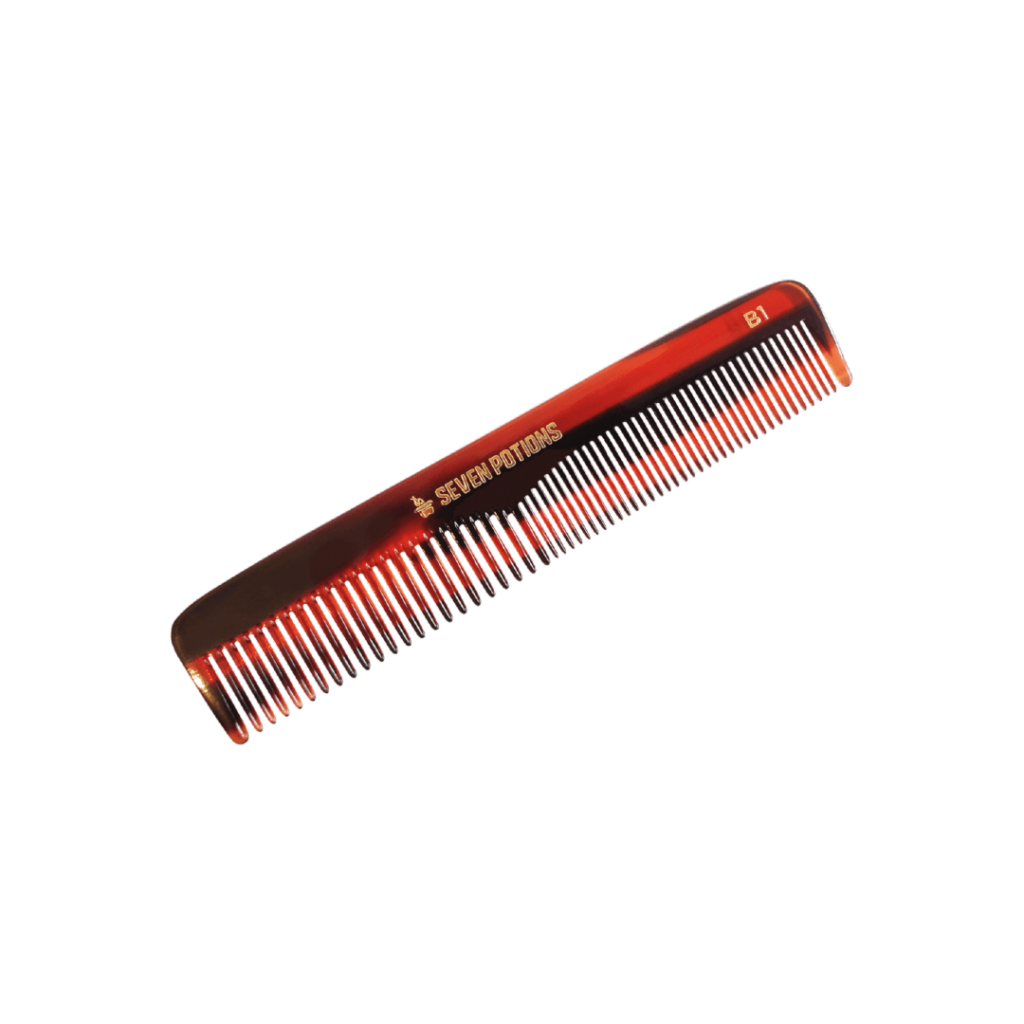 Taking pride in your appearance starts with a quality grooming routine that extends to maintaining your look throughout your day by using the right tools for the job. Seven Potions’ combs are hand-crafted and made with precision. They are sawcut and hand polished from cellulose acetate, a robust, versatile, and sustainable non-petroleum polymer. In addition to being eco-friendly and gentle, moving smoothly through hair without breaking it, they also resist static and pull excess moisture from your hair as they work.