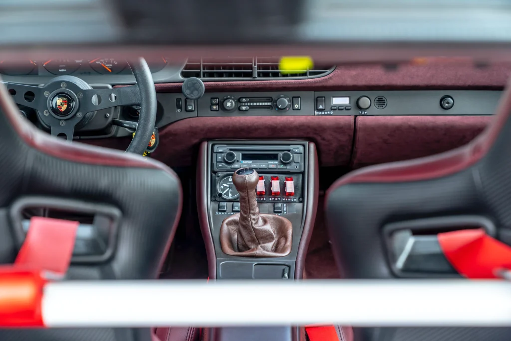 This exemplary example of a race ready vehicle was originally delivered in Alpine White (L90E) and is now wrapped in the iconic ‘Rothmans’ colour scheme of the 1986 Paris-Dakar-winning Porsche 959, and it also includes faithful reproductions of that car’s race decals so there is an added sense of authenticity to proceedings and makes this the ideal purchase for any race aficionado out there. The original burgundy (LX) interior has been fitted with two burgundy Braum Racing Elite X seats and red Sabelt harnesses, and the dashboard has been fully recovered in burgundy, Italian Alcantara with French stitch.