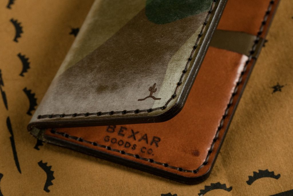 The vegetable tan leather of this Slim Wallet in Ghost Camo from Bexar Goods Co is top grade and it is full grain with a nice balance between supple and firm. The firmness will make for a more robust wallet that will break in and soften over time. It is definitely the most ambitious leather Bexar have used to date. To tell a story with your wallet, the Ghost wallet would undoubtedly be the right author of that story.