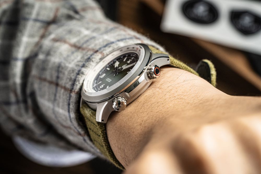 Constructed from 316L stainless steel, the case is built for the harshest, most uncompromising of conditions, offering outstanding resistance to both extreme heat and corrosion. It incorporates dual crowns within its 41mm rounded design, achieving a 200m water resistance rating. The watch measures 47.5mm from lug-to-lug, has a thickness of 12.8mm, and a lug width of 20mm.