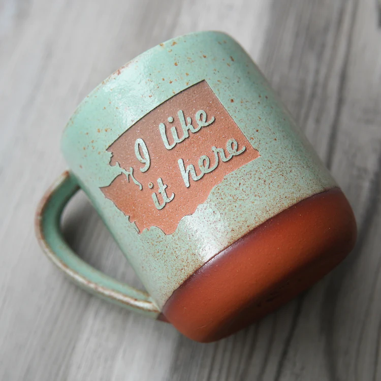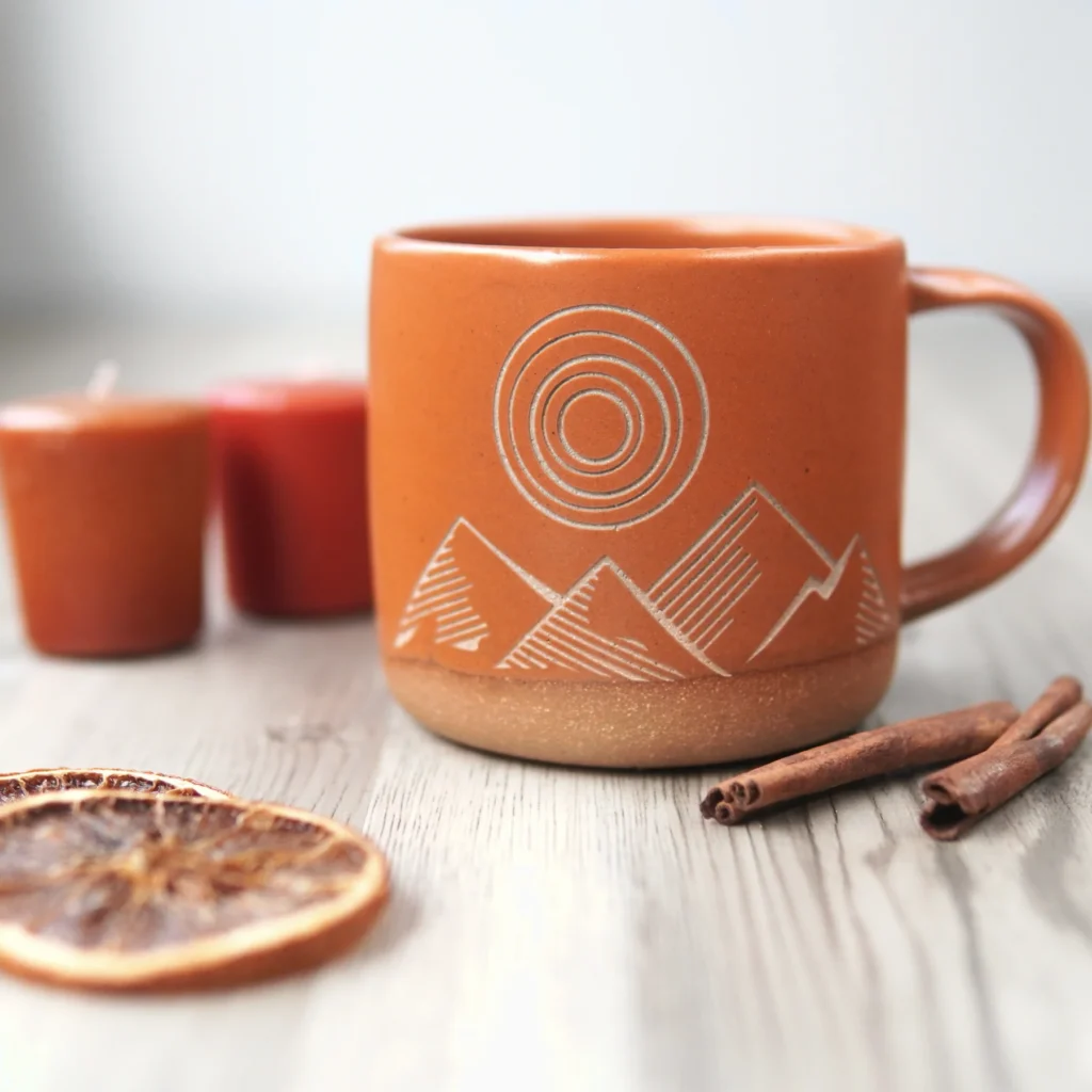 These charming farmhouse-style mugs are meticulously hand-thrown on the wheel using brown clay, followed by sand carving our unique designs through the glaze, which is both lead-free and cadmium-free. Crafted in small quantities, each piece is thoughtfully handmade in Portland, OR.