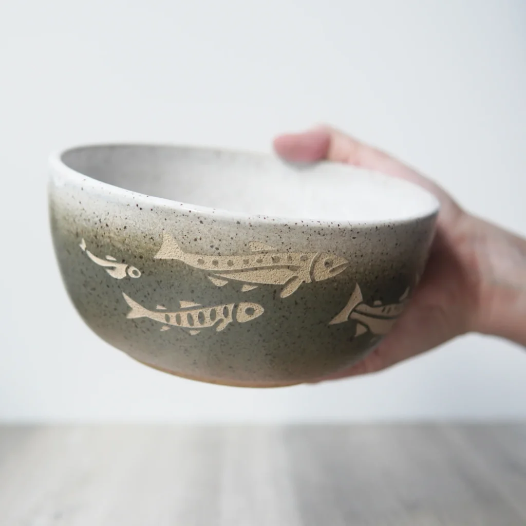 Bread & Badger’s fish ramen bowl, adorned with an engraving of the sockeye salmon life cycle on one side, offers the pinnacle of rustic sophistication. Embrace your inner introvert with this distinct, handcrafted pottery piece. Ideal for times when you wish to enjoy a peaceful bowl of ramen without any disturbances.