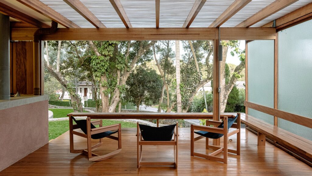 The terrace gardens at Casa dos Terraços Circulares were made with the soil that was removed to create the home’s foundation, which meant there was less need for concrete in the landscaping of the plot. They also act as retaining walls that help keep the current selection of trees in place. This heavy earthen curvature is cleverly juxtaposed with the linear property that is crafted with a prefabricated wooden structure that has an almost Mid-Century vibe we love here at The Coolector.