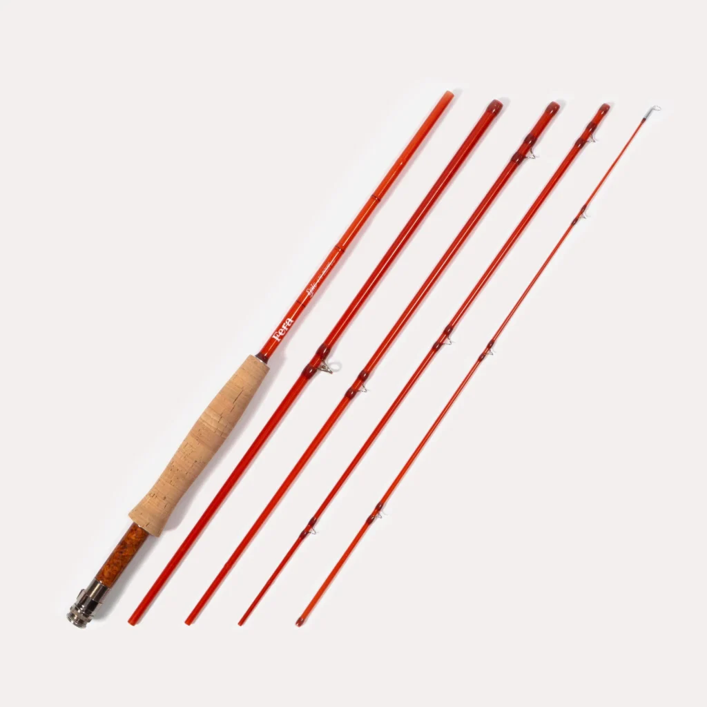 Fera has left no stone unturned on this glass rod. Constructed in the brand’s orange colourway, it features an uplocking Struble U20 in nickel silver finish with a light, highly figured Amboyna wood insert and custom Snake Brand Ecolite guides attached with Kimono silk wrap. These rods are a thing of beauty and only two are available.
