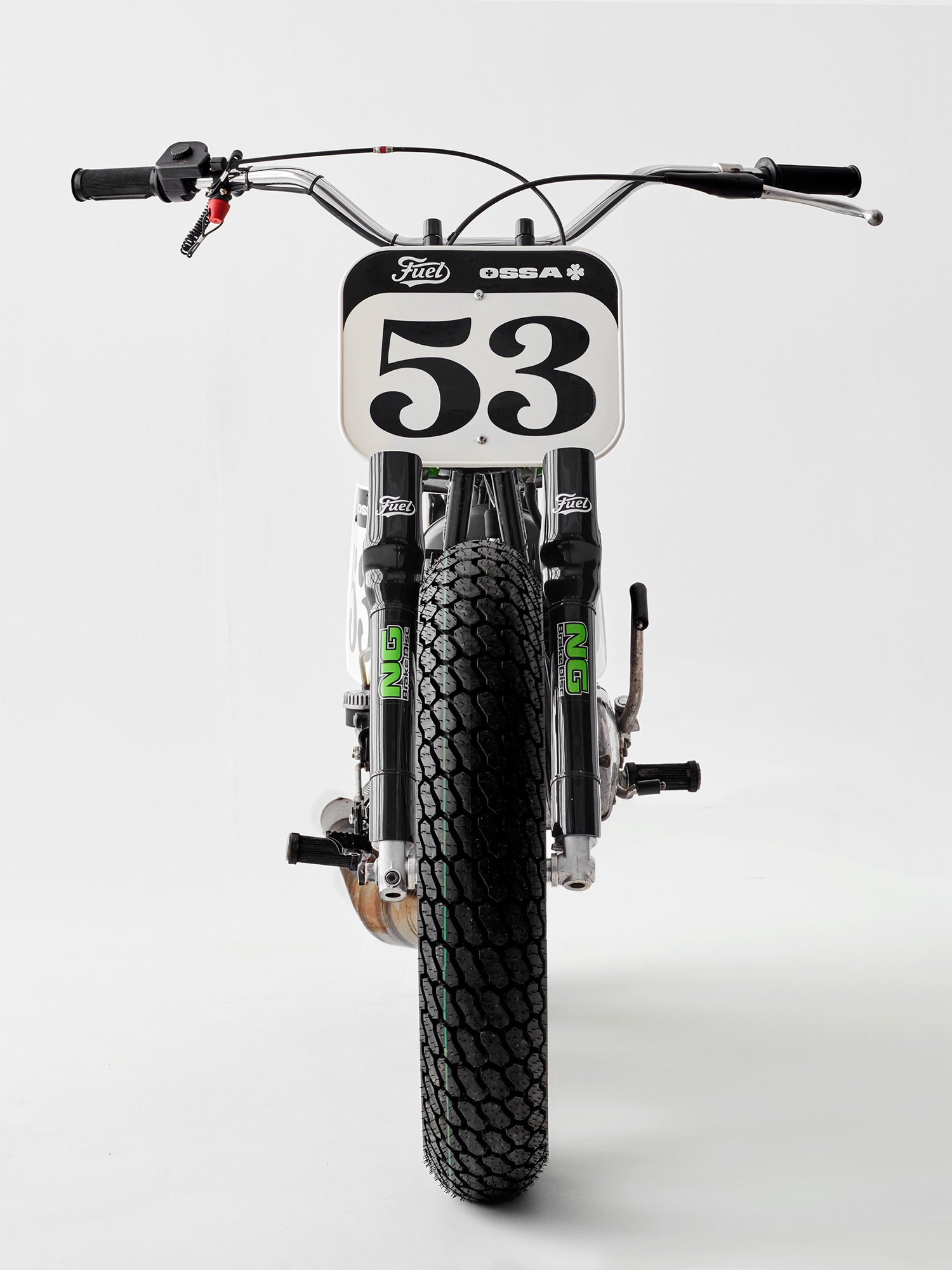 For this build, the guys at Fuel Motorcycles were able to use a locally-sourced, free-range Ossa. The 2-stroke Pioneer 250 was vastly popular throughout the ’70s in Europe and America and they boasted a lofty reputation as an uncompromising winner. Fuel wanted this custom to be competitive on the road as well as being visually superior – as the bike is due to make its debut at the ‘El Rollo’ flat track event as part of the French ‘Wheels and Waves’ festival.