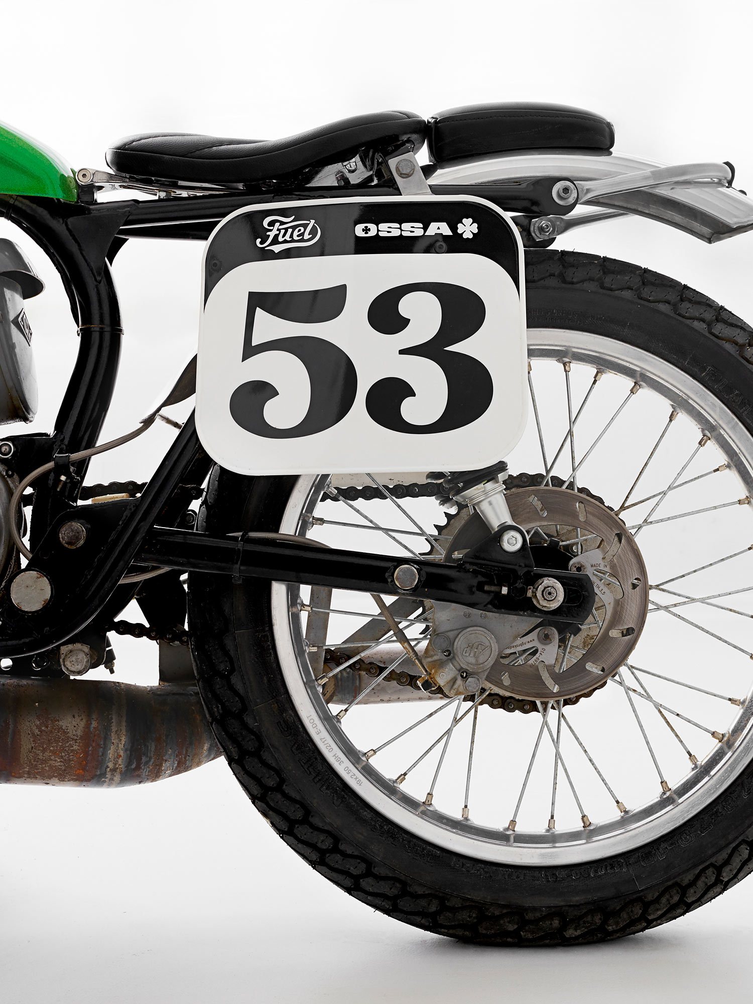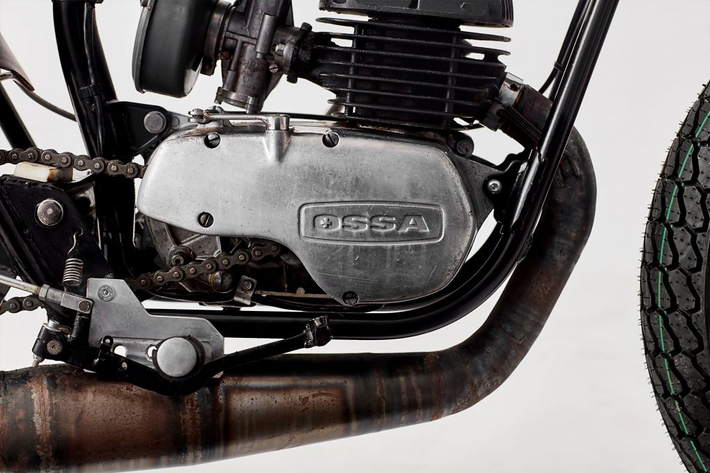 Given the understated nature of the exterior, you’ll be surprised to hear how much is going on inside this breathtaking bike. At the front twin, 41mm forks were adapted from a Kawasaki. At the rear of this Wasp OSSA Motorbike, the hub and brake assembly are taken from a Beta 80, with Mitas dirt track tires sported at both ends. A YSS rear shock keeps the back-end under control.