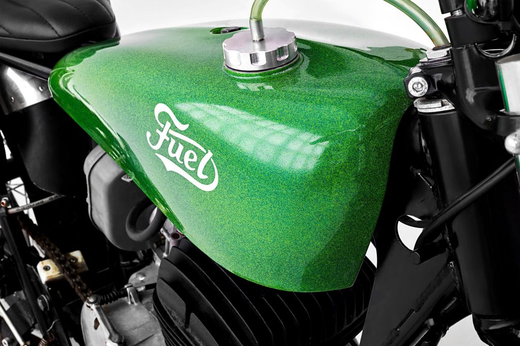 Fuel found a Triumph Trackmaster fibreglass fuel tank, as well as a retro single-seat and metal rear fender as the foundation for this mighty impressive build. To fit this to the Green Wasp, the Fuel Motorcycles team had to modify the rear of the subframe to ensure a snug fit, something which was vital to giving the bike a ‘semi-stock’ appearance.