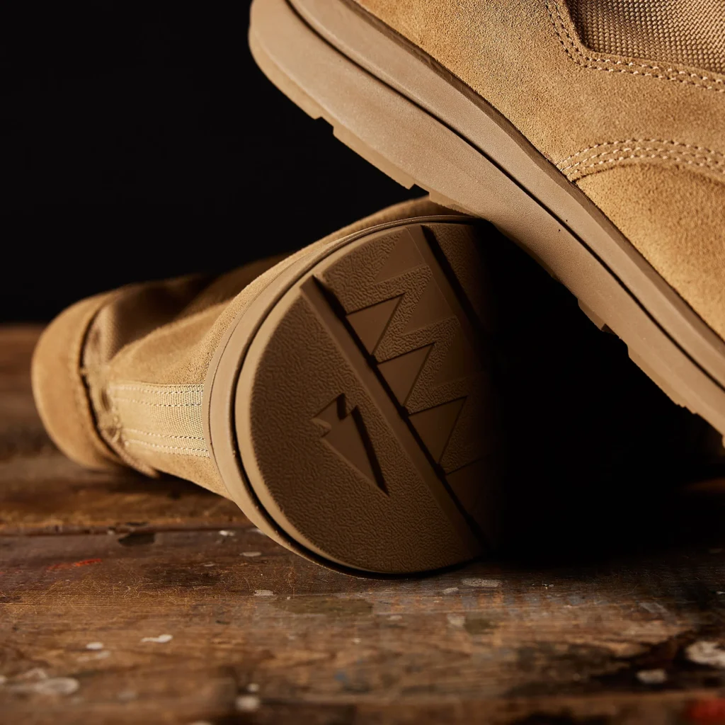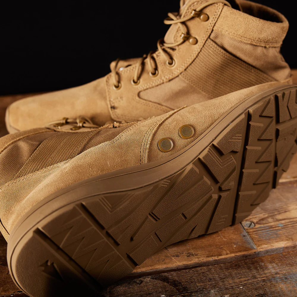 The dual-compound rubber outsole of the Goruck MACV-1™ Hi-Speed Mid-Top Boots ensures an all-around performance on any surface, including wet and muddy terrain. The forefoot is crafted from a rubber compound that provides enhanced grip, while the heel area is made of a rubber compound that provides abrasion resistance and durability. The outsole also wraps up at the toes to provide understated protection against rough terrain or when doing push-ups.