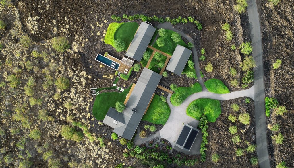 The term “Hale Kiawe” combines the name of the native trees with the Hawaiian word for house, reflecting the project’s deep-rooted connection to its surroundings. The buildings feature wood siding and corrugated metal roofs, drawing inspiration from the agrarian structures that once populated the area. Simple lines and geometries create a striking contrast with the rolling landscape and the stunning coastline in the distance.