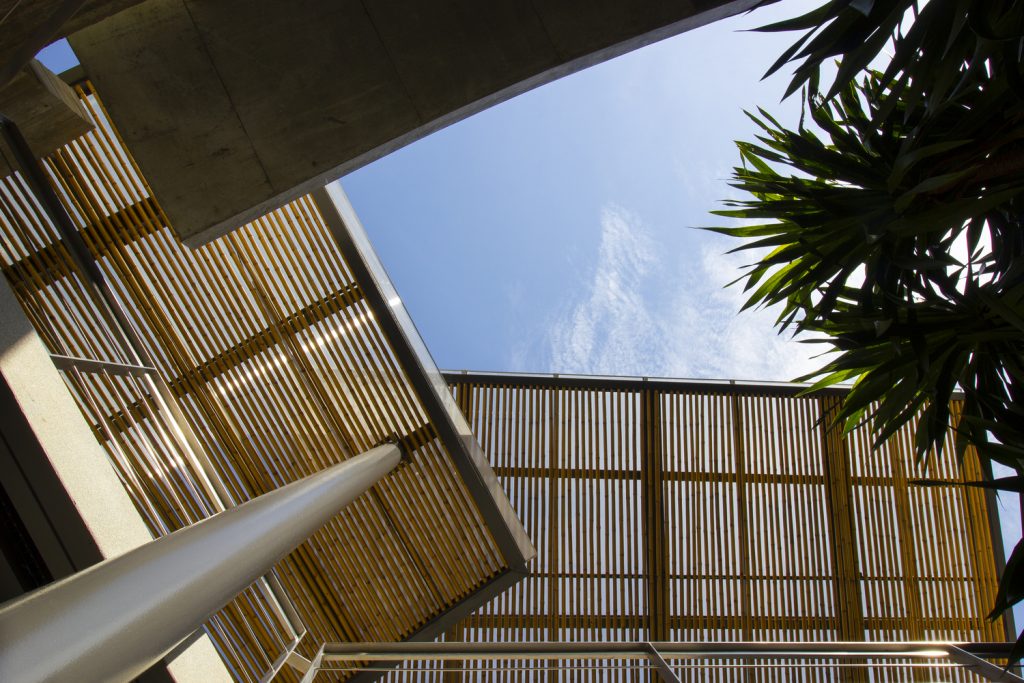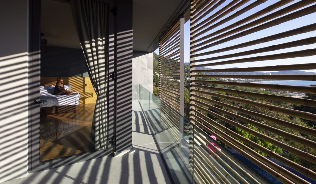 To shade the home from the strong tropical sun and for additional privacy, the designed added huge sliding bamboo screens which have been installed in front of all the upper floor bedrooms. Bamboo is used throughout the house for sun-screening -both vertically and horizontally and adds a pleasing rustic aesthetic . The living level is where a huge infinity-edged swimming pool extends out into the horizon like a giant circular mirror that reflects the sky while echoing the effortless curve of the bay.