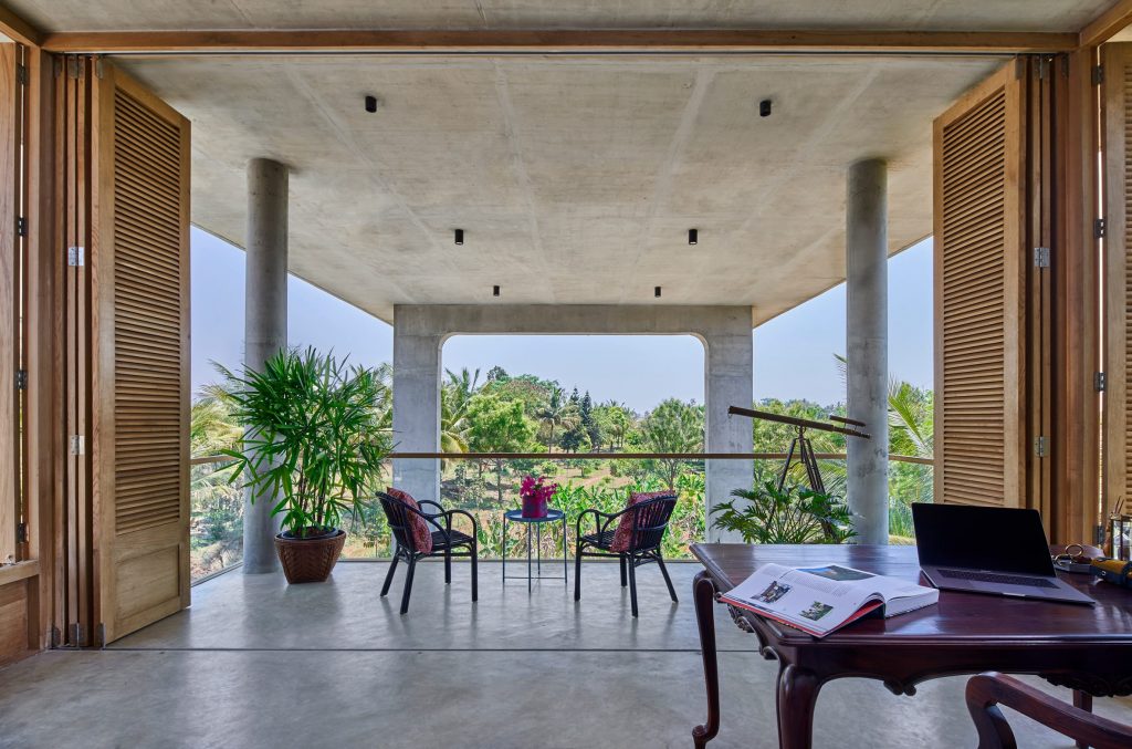 This amazing property perfectly combines a range of architectural forms and motifs, which includes arched doorways, oak shutters, colonnade-style columns, a floating staircase and overhanging roof slabs. The landscape surrounding it consists of tiered terraces, a swimming pool, meandering pathways and a vast array of plant life including chikoo, mango and banana trees.