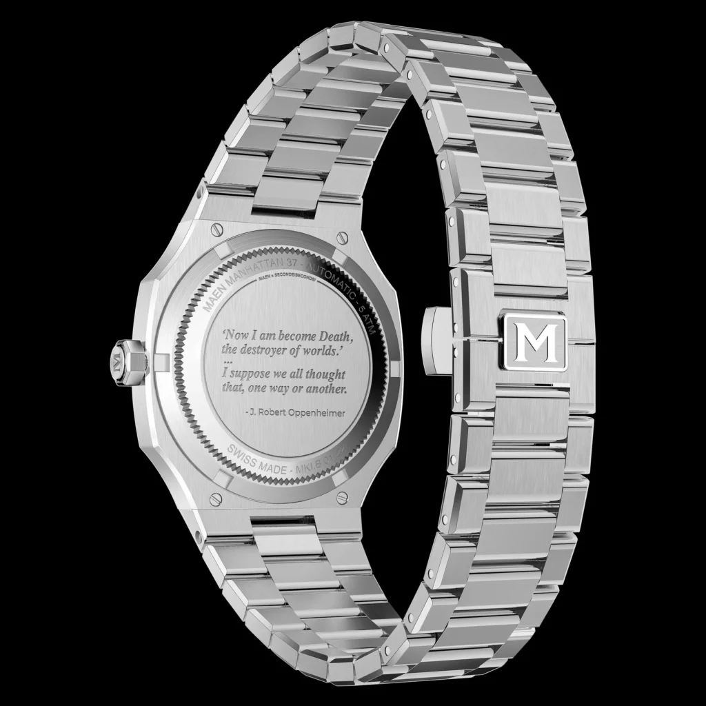 The MANHATTAN PROJECT watch is a tribute to a pivotal moment in human history, capturing both the monumental achievement and the terrifying potential unleashed by the Manhattan Project. By erasing the dial and modifying the seconds hand, MAEN and Seconde/Seconde/ aimed to reflect the concept of nuclear void and the profound impact of opening Pandora’s box. The caseback features a poignant quote from J. Robert Oppenheimer, taken from the Bhagavad Gita, highlighting his remorse and the enduring dilemma associated with groundbreaking discoveries.