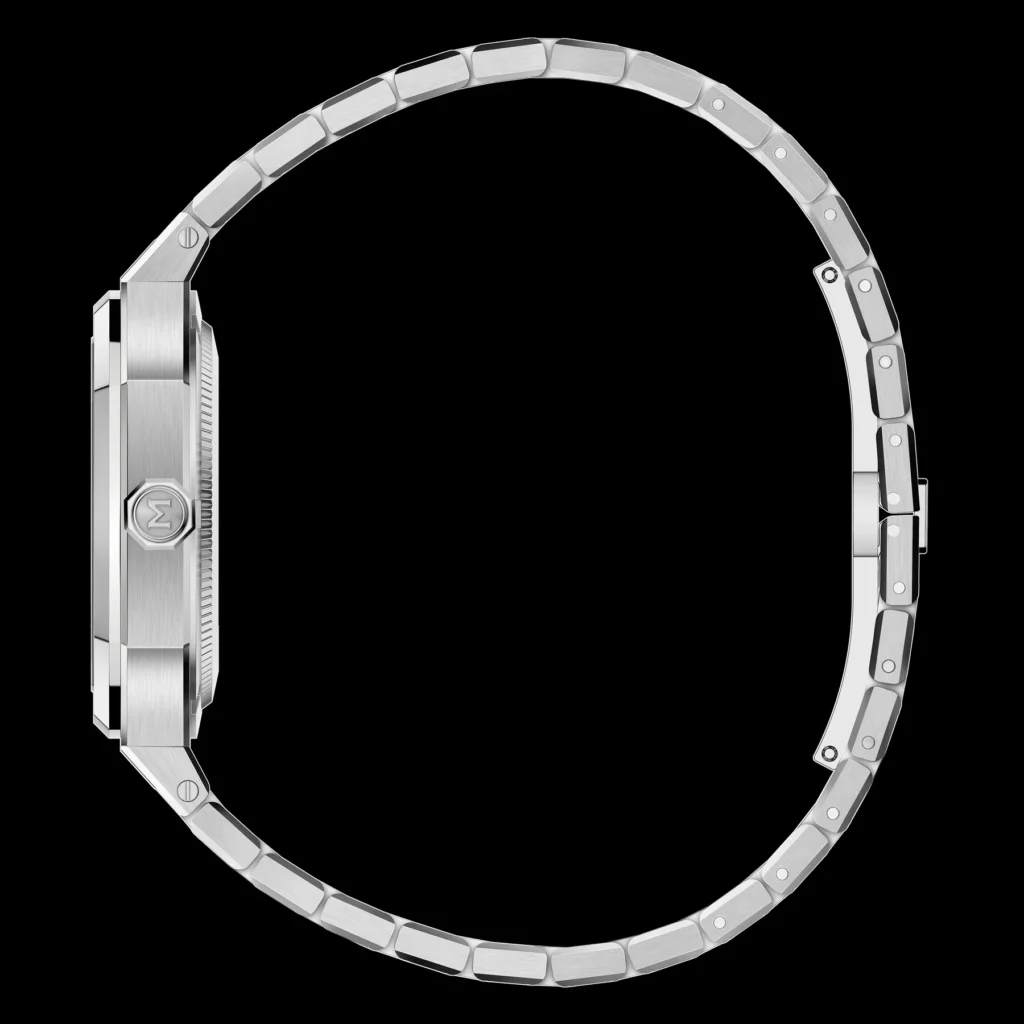 Drawing inspiration from landmark timepieces of the 1970s, the MANHATTAN 37 maintains a modern yet timeless appeal. The watch features a steel case with a vertically elongated octagonal bezel, paired with an integrated stainless steel bracelet. The combination of polished and satin-brushed finishes accentuates the unique shape of the case and bracelet, creating a cohesive and sophisticated look.