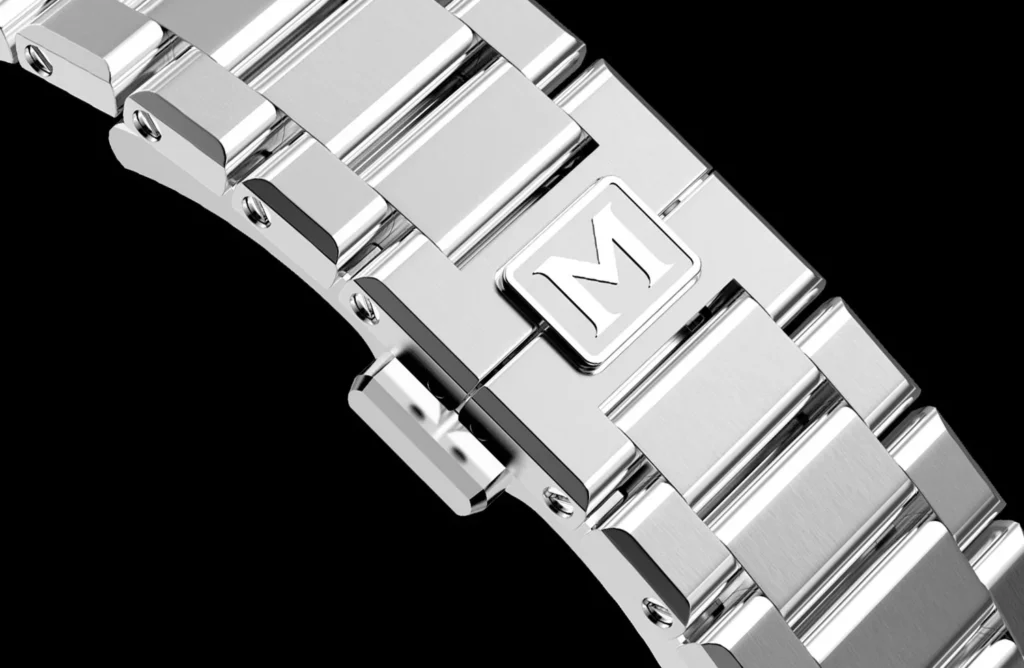 The integrated design of the MANHATTAN 37 allows it to wear larger than its 37mm size suggests, offering a substantial presence on the wrist. The bracelet is meticulously crafted, featuring a hidden deployant clasp and connected to the case with four screws, enhancing the vintage character of the watch. The gradual taper and individually sized links ensure a comfortable fit, while the satin-brushed finish with polished chamfers adds a touch of elegance.