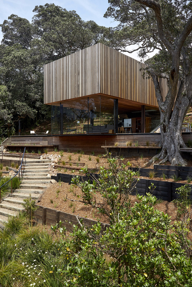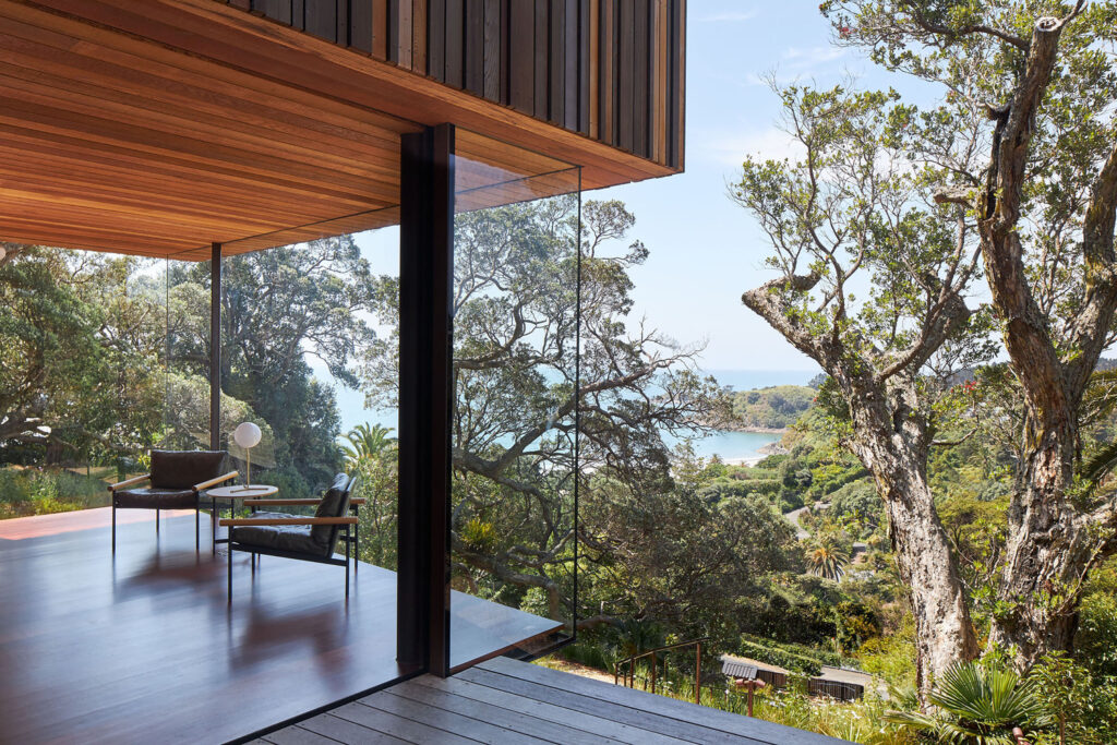 The steep, elevated location offers expansive views of Mawhitipana Bay and is adorned with mature, protected Pōhutukawa trees that create a vast, dominant green canopy. A lengthy, timber deck stretches across the entire width of the narrow site, carefully positioned among the Pōhutukawa trees to avoid disturbing their roots and nestled under their canopies.