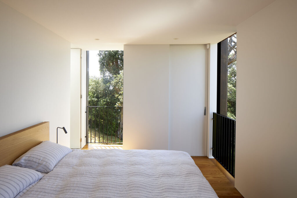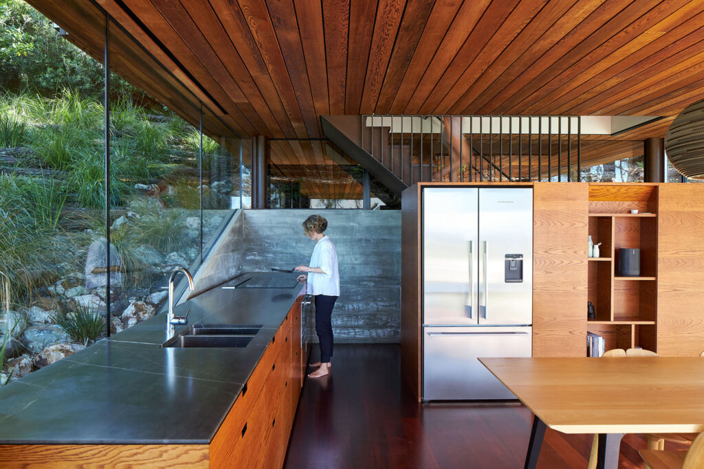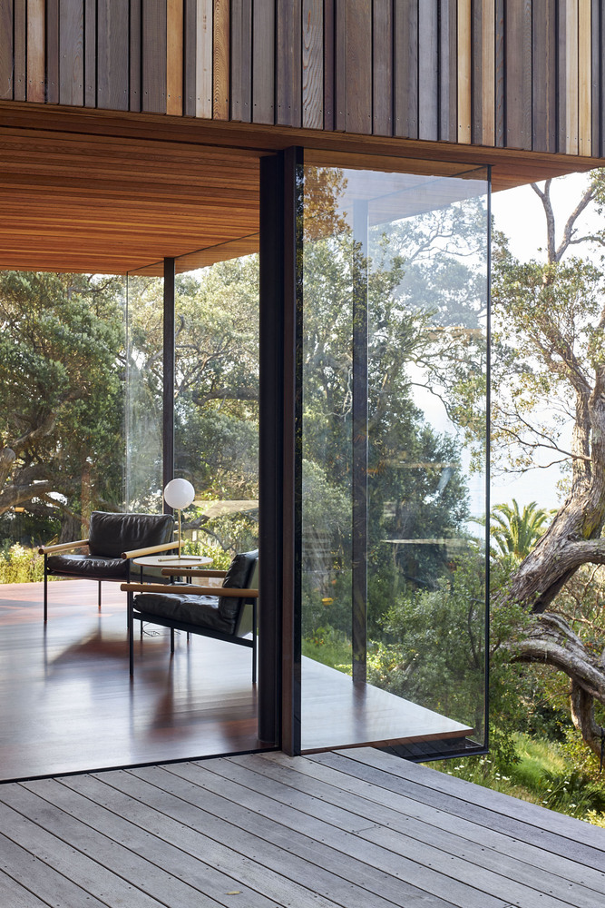 Elevated on six steel columns, the upper floor’s timber box is encased in a cedar rainscreen with integrated timber shutters. These shutters offer a feeling of seclusion to the spaces on the upper floor, providing a sharp contrast to the transparent, open design of the ground floor below. The substantial timber shutters conceal the full-height windows, which can retract into a concealed pocket behind the cedar rainscreen. This design enables the shutters to be closed, while the windows remain open, allowing the sounds of bird calls and the beach waves below to permeate the space.