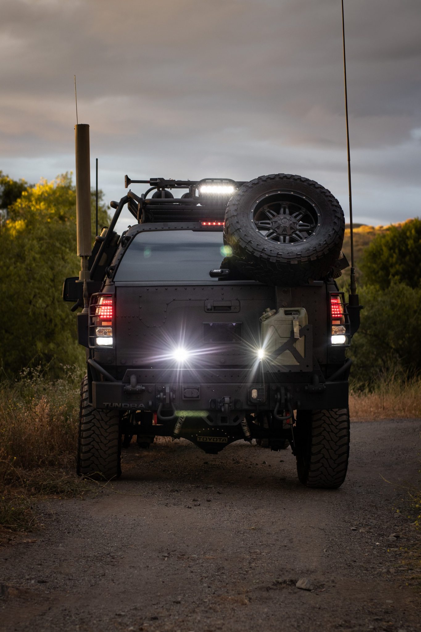 Lighting is provided by aftermarket LED headlights with a GTR Lighting conversion kit, smoked Spyder LED taillights, Vision X 6.7″ Cannon driving lights, and ARB Intensity V2 LED driving lights. There is also a roof-mounted winch that lowers the spare-wheel assembly and allows for normal use of the tailgate. Additional rear damping is provided by Fox 2.0 Performance Series shocks mounted between the rear axle and the chassis.
