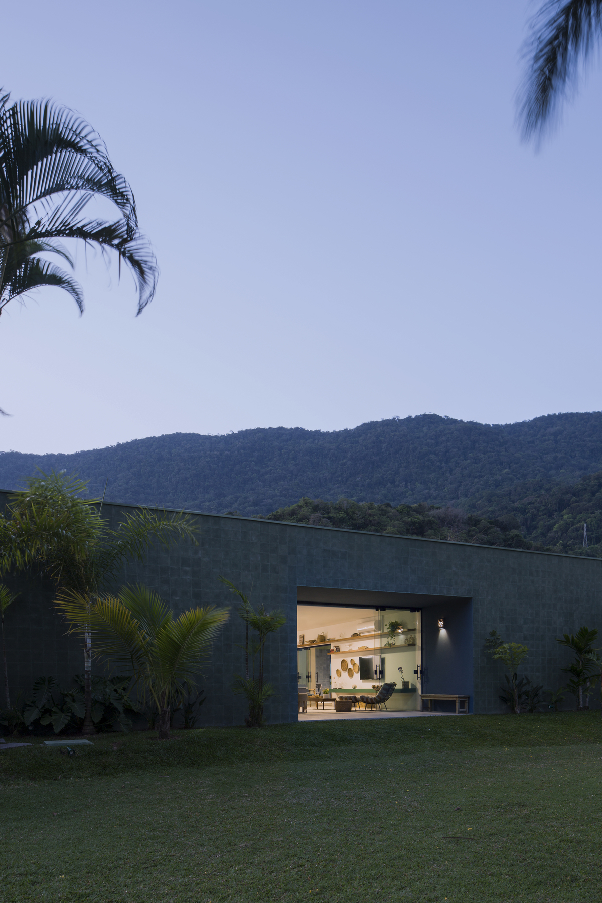 The volume of Patropi House is made out of two solid blocks, the service area and the living spaces, and a covered core, which serves as a social area. On the façades, these volumes appear as blind planes: the bedrooms and the service area had their openings facing the sides, to allow for much greater privacy. Meanwhile, the social area frames the garden on the back façade and the mountains on the street side.
