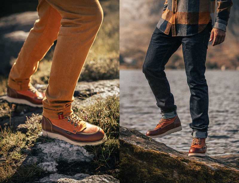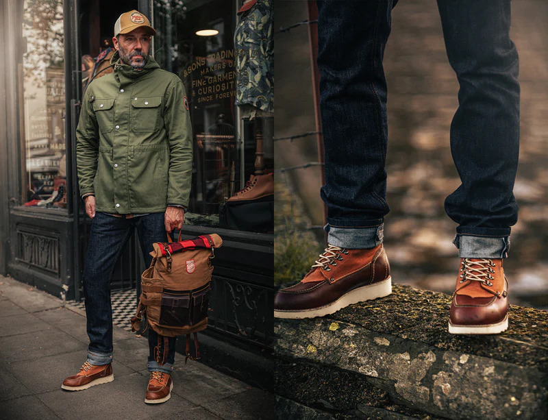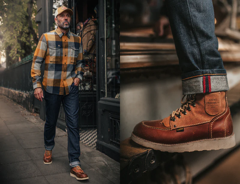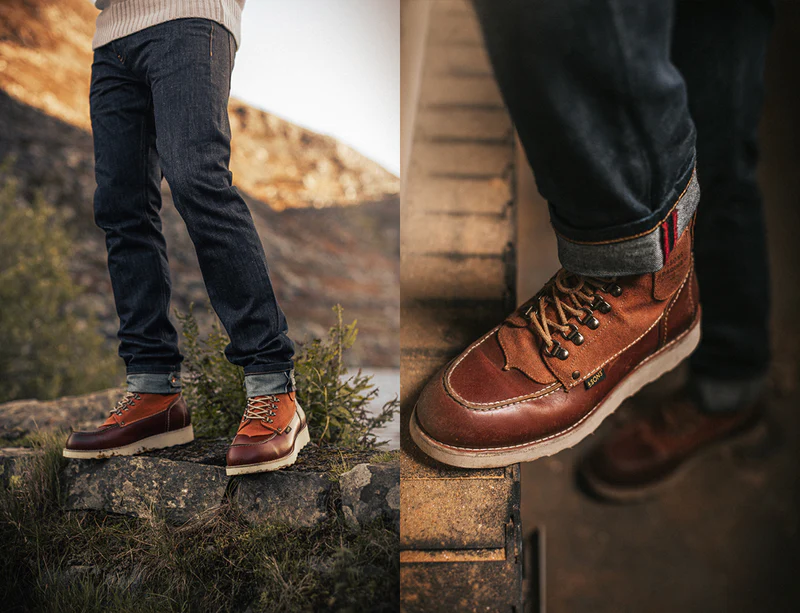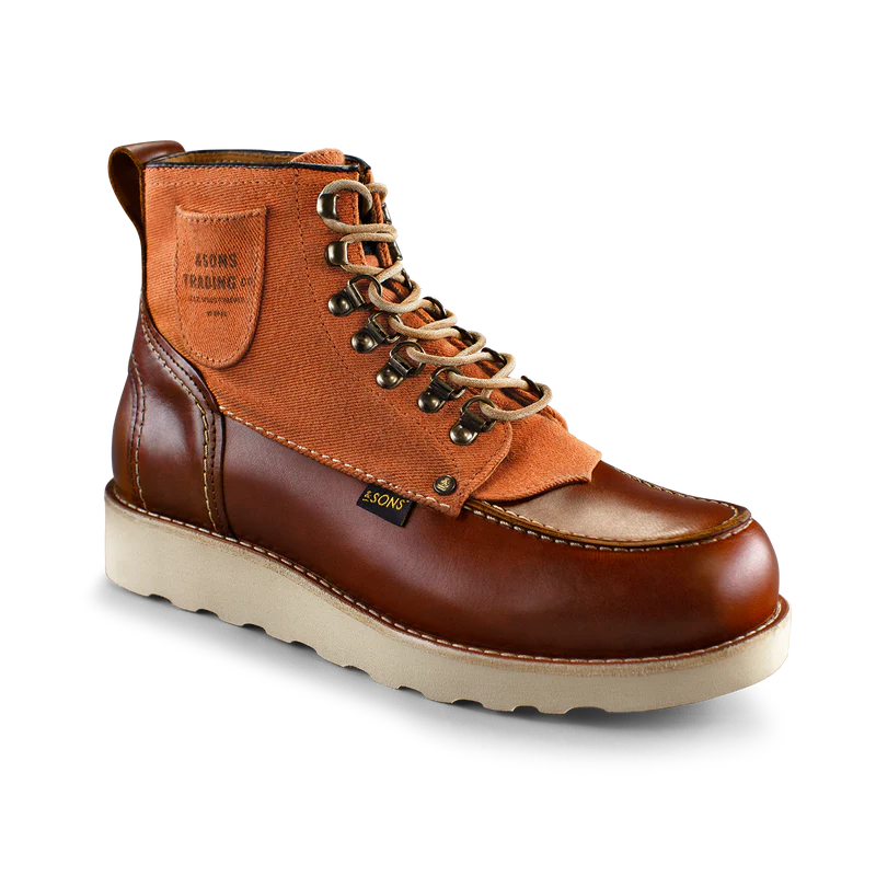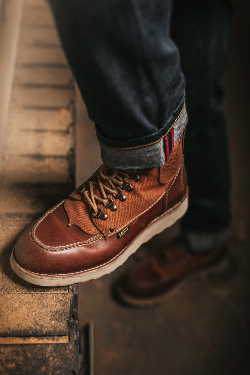 &SONS has embellished the Valley Boot with golden brass eyelets and retro speed hooks, echoing the sturdy walking boots of the past. The traditional brown leather laces pair flawlessly with the tan leather and canvas combination, offering a unique aesthetic that radiates style and robustness. “Moc-toe” is an abbreviation for “moccasin toe,” referring to boots usually crafted from leather with a distinctive, rounded, and visibly stitched toe box. Originating in the early 1950s, this classic boot was created to meet the tough requirements of farmers and hunters, designed for those who faced the harsh conditions of the outdoors on a daily basis. This version from &SONS honours that tradition whilst making them fit for the 21st century in the process. Win, win.