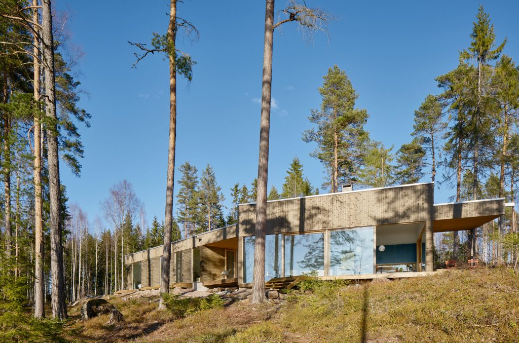 The Stockholm Lake House from Dive Architects is located in isolated woodland to the north of Stockholm and it has been purpose-built to gradually merge with nature as the surrounding birch and pine forest grows. Sitting on a plot which slopes down towards a lake, the timber-framed property has been split into two volumes and offers the ultimate in understated elegance both inside and out.