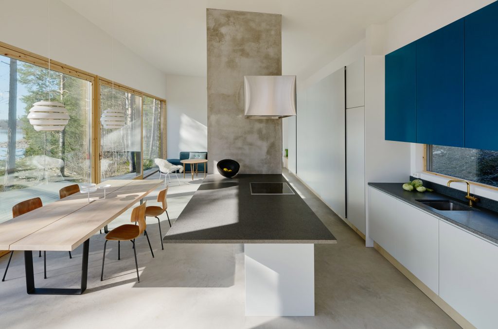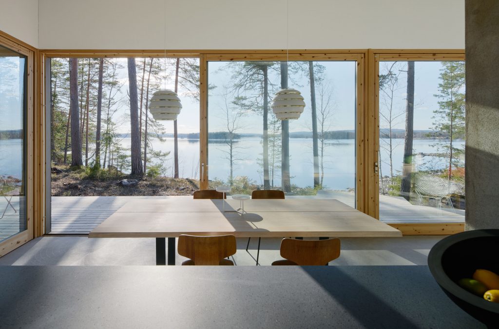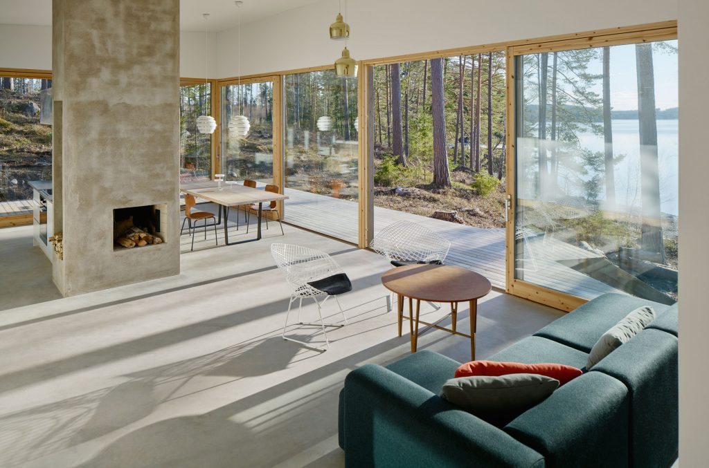 Smaller windows look out eastwards from the Stockholm Lake House towards the forest, which allows the morning sun to illuminate a countertop as well as the central kitchen island. There is a rendered brick fireplace which acts as a focal point in the living and dining room and then through into the kitchen.