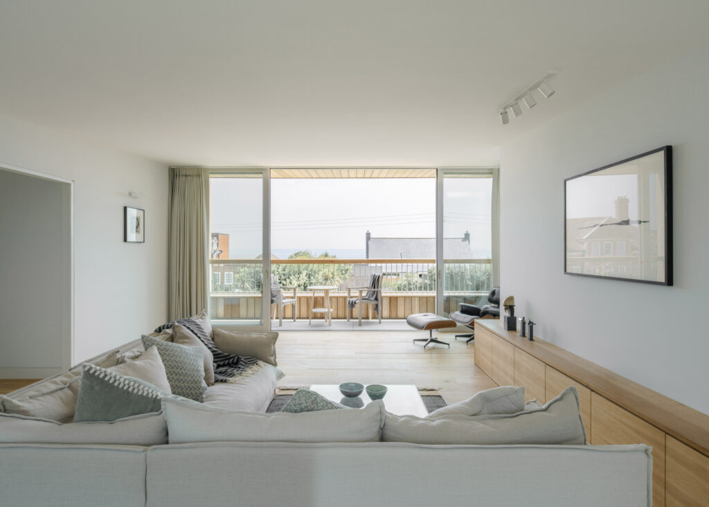 Beautifully designed, Thorpeness Beach House is situated on a scenic stretch of Suffolk’s coastline, nestled between the beach and a patch of woodland. The layout of this holiday home has been cleverly orientated to capture views of this glorious setting, but also to be practical for the types of outdoor activities that come with it, such as surfing and hiking. The living and dining areas can be found in the middle of the building, sandwiched between bedroom and utility areas. Sliding glass facades at the front and back of the home allow occupants to completely open this space up to the elements – which is great for hot summers.