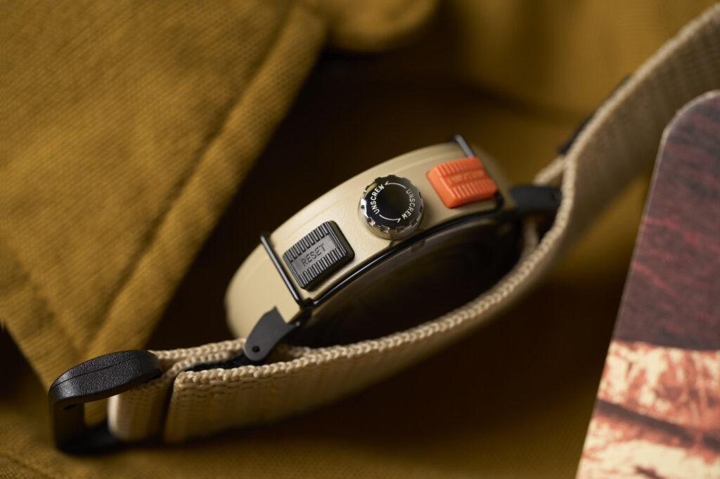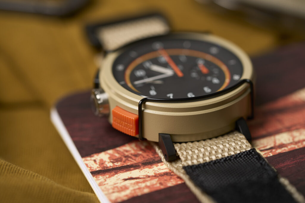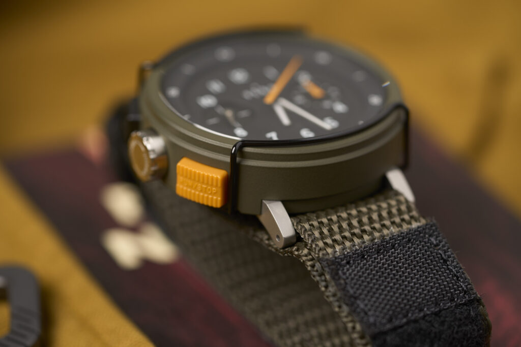 Oversized crowns and pushers on the Vero Workhorse Chronograph Watch ($425) create the illusion of a smaller size and are easy to use even when in an active situation. The “destro” or left-side design adds additional comfort on the wrist for the wearer, as well as straightforward access to the internal bezel crown at the two position. The Cerakoted shroud is protected from scrapes and bumps via a metal-wire bumper, which also adds to the overall uncompromising aesthetic of this timepiece.