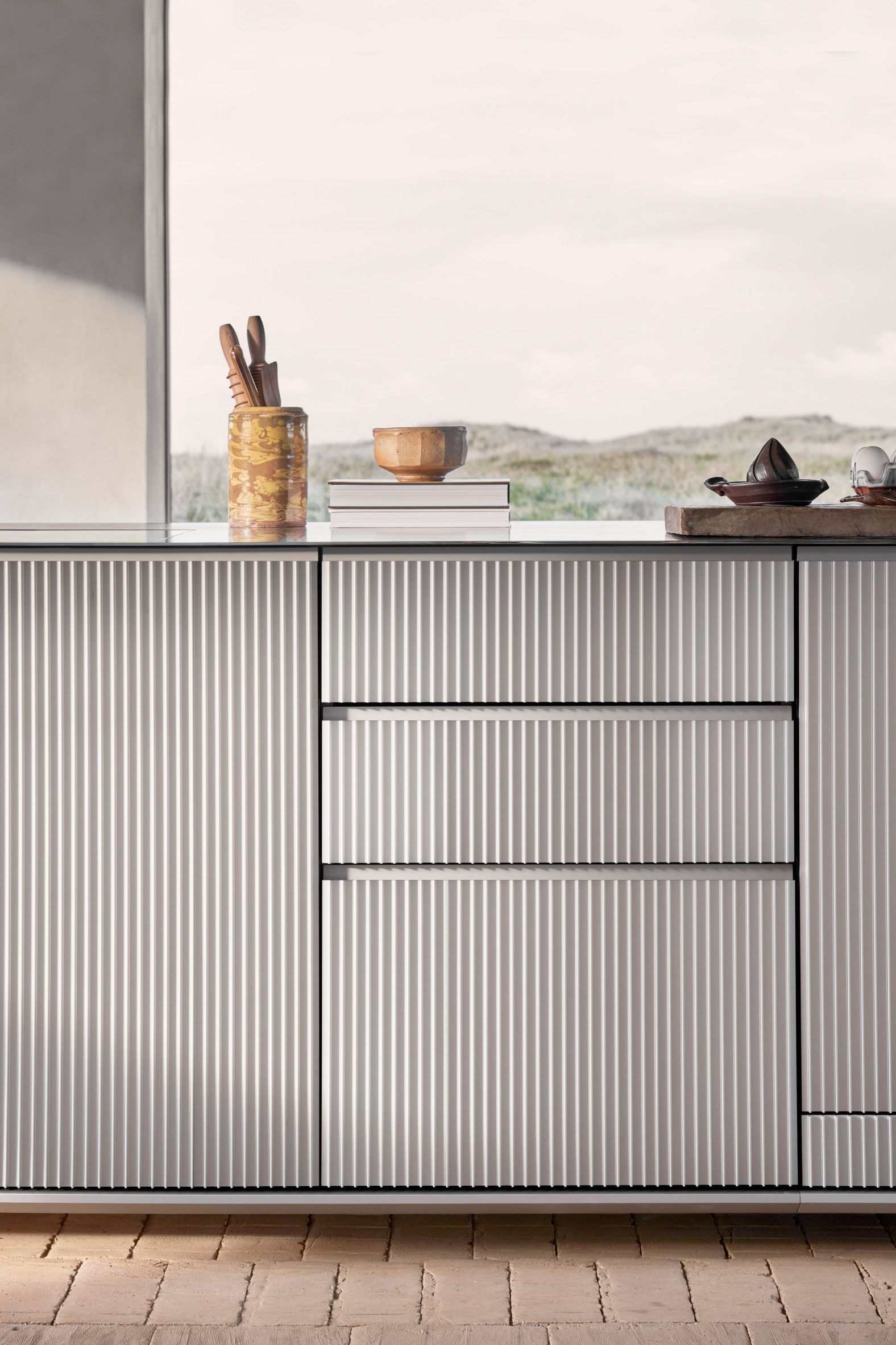 Within the segmented areas created by the main dividing walls, smaller sections are delineated by additional white-washed partitions, including a space that houses a Vipp kitchen. This kitchen features an anodised aluminium island and integrated oak cabinetry, seamlessly flowing into the dining area.