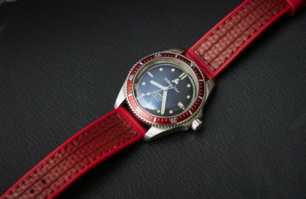 The Red Watch from William Wood Watches is the crowning glory of their Valiant Collection and it is a limited edition release and each one comes with a unique engraving between 1 – 250 on the caseback that makes it all the more exclusive. This adventure ready timepiece is water resistant to 100m and has Super-LumiNova on the indices, hands and bezel so you can follow the time no matter how dark your environment may be.