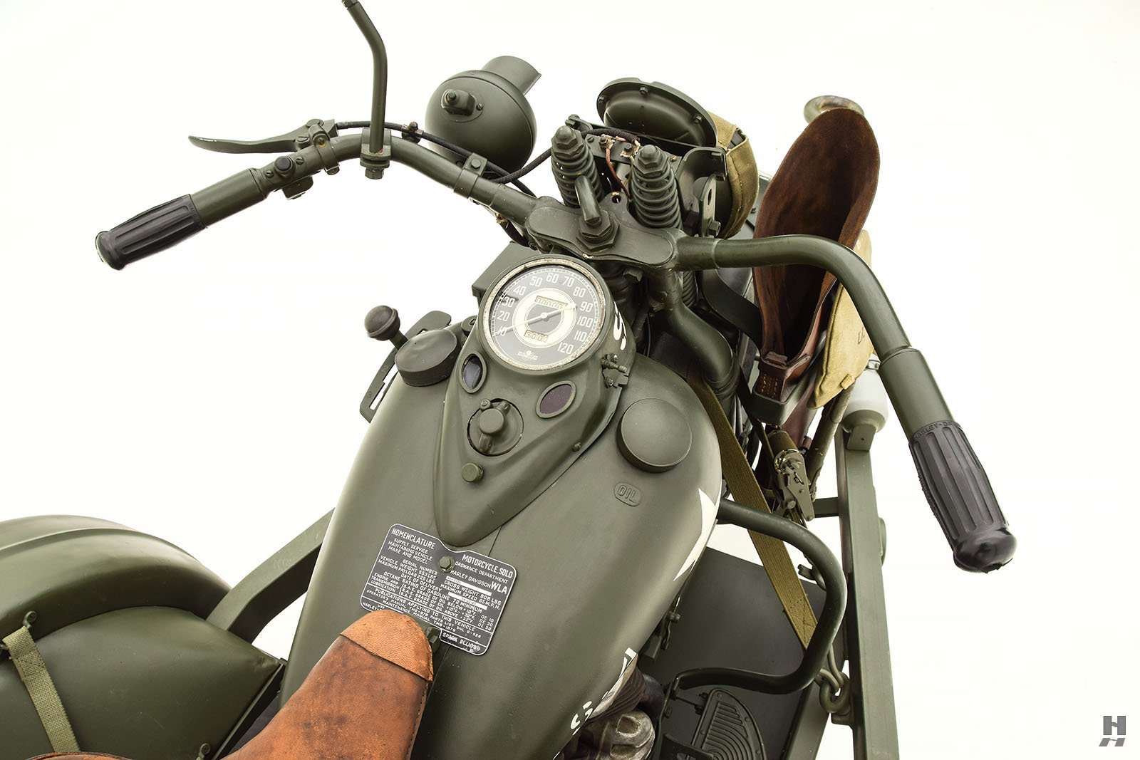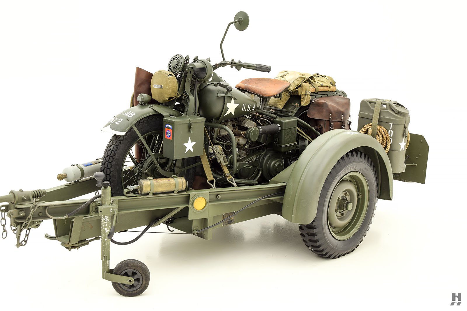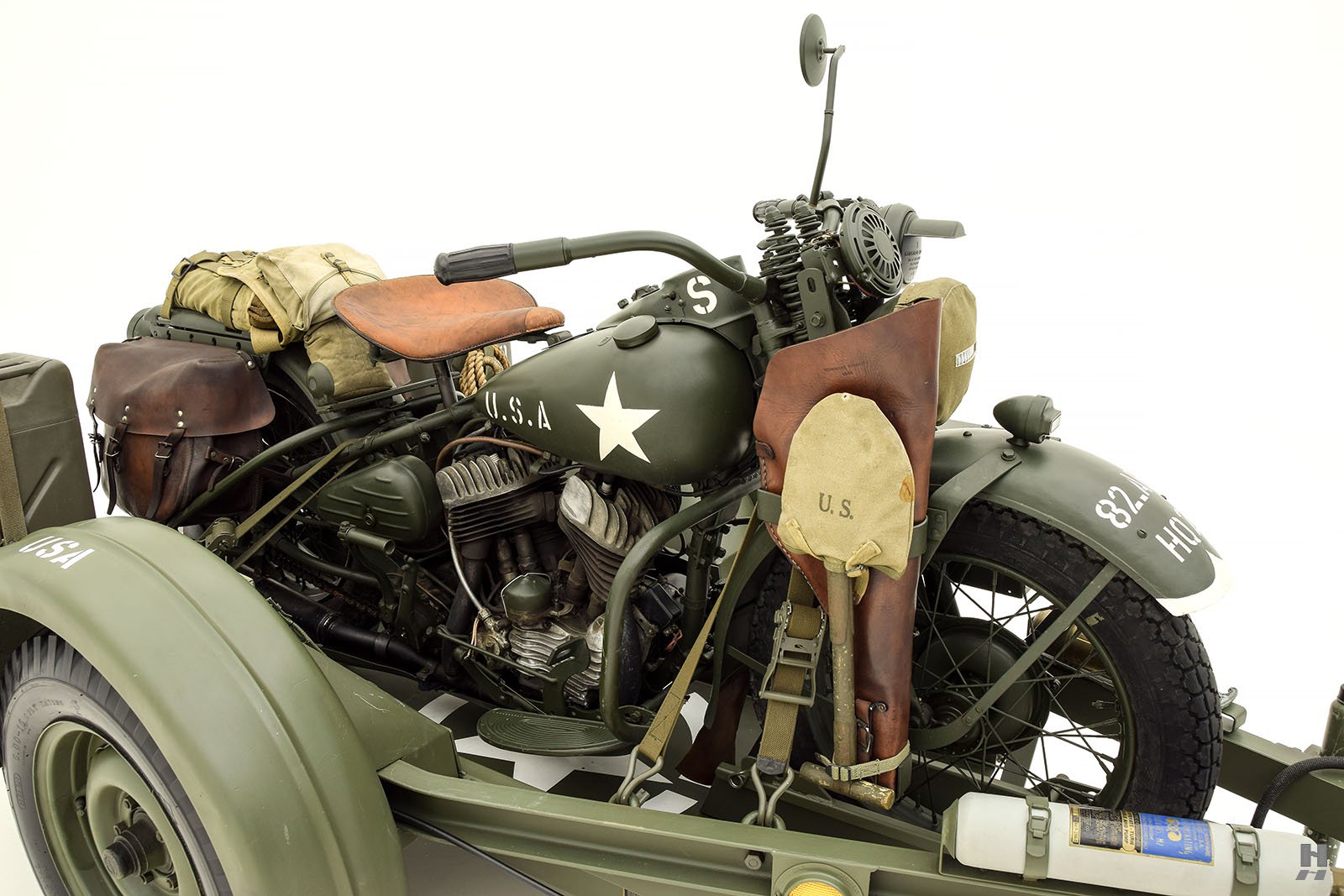 Towed behind the truck is a top quality replica trailer which has been crafted using period photographs and documentation. Everything you’d expect is there down to the authentic spring-dampened pintle hitch and military-spec wheels. Needless to say, some creative license needed to be taken in its construction, but it has a very authentic look and feel, especially in the small details like the jerry cans and ropes. The Harley Davidson WL was found years ago in a barracks, in its original state. The previous owner expertly restored the bike with just about every available accessory for the day, while still respecting the highly original condition.