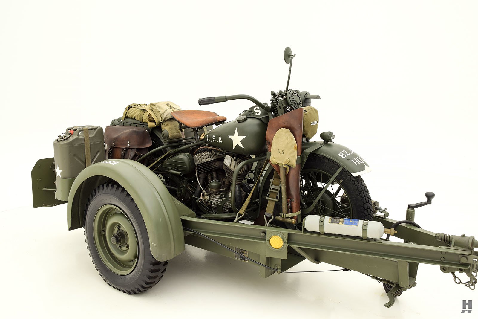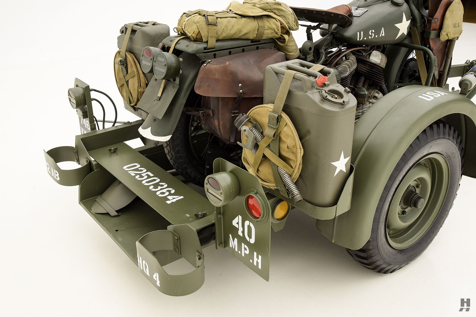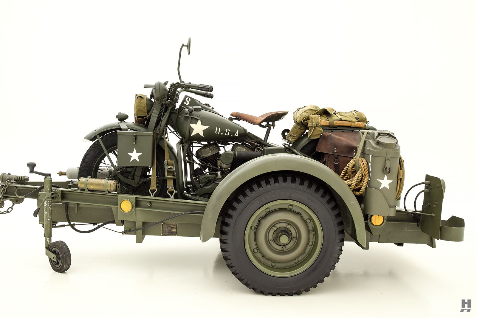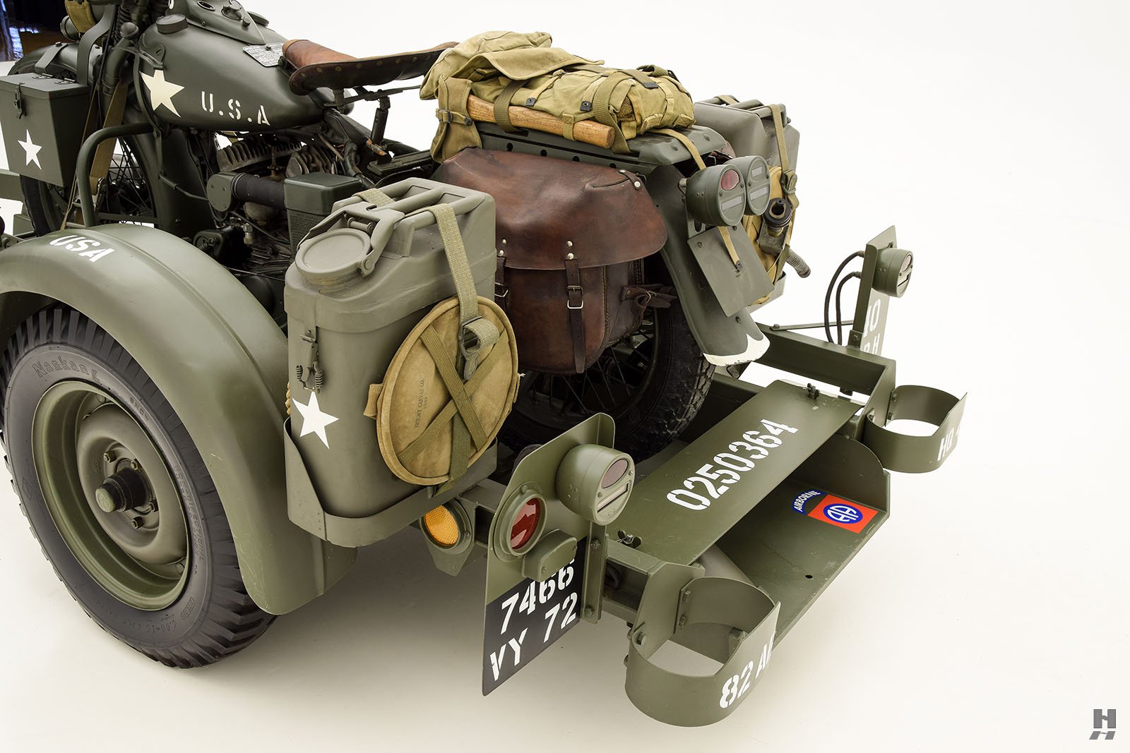 Towed behind the truck is a top quality replica trailer which has been crafted using period photographs and documentation. Everything you’d expect is there down to the authentic spring-dampened pintle hitch and military-spec wheels. Needless to say, some creative license needed to be taken in its construction, but it has a very authentic look and feel, especially in the small details like the jerry cans and ropes. The Harley Davidson WL was found years ago in a barracks, in its original state. The previous owner expertly restored the bike with just about every available accessory for the day, while still respecting the highly original condition.
