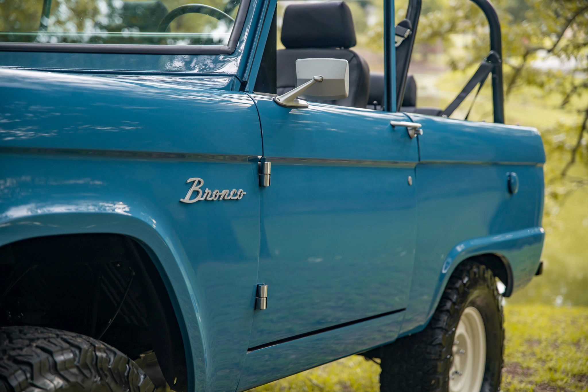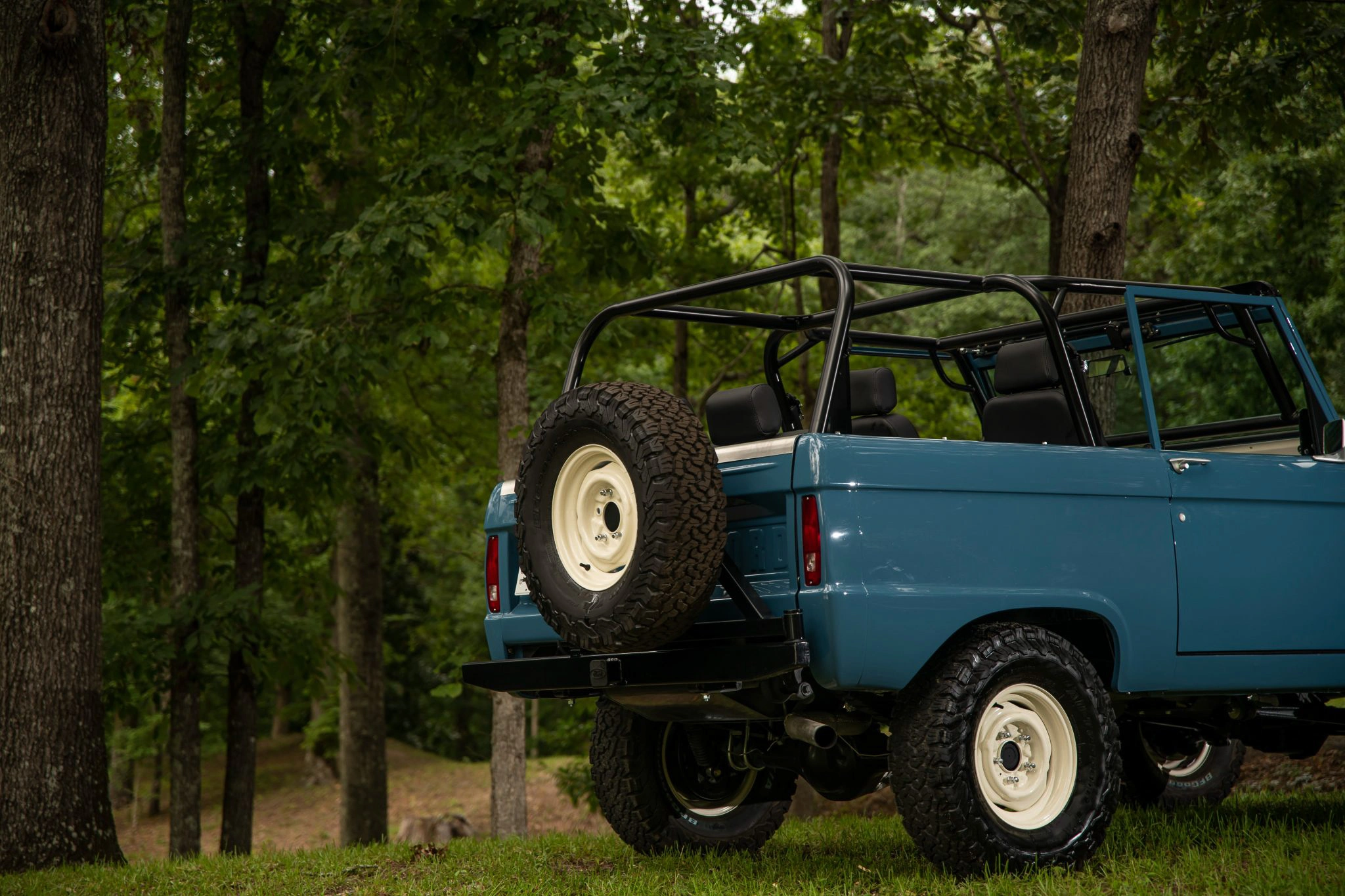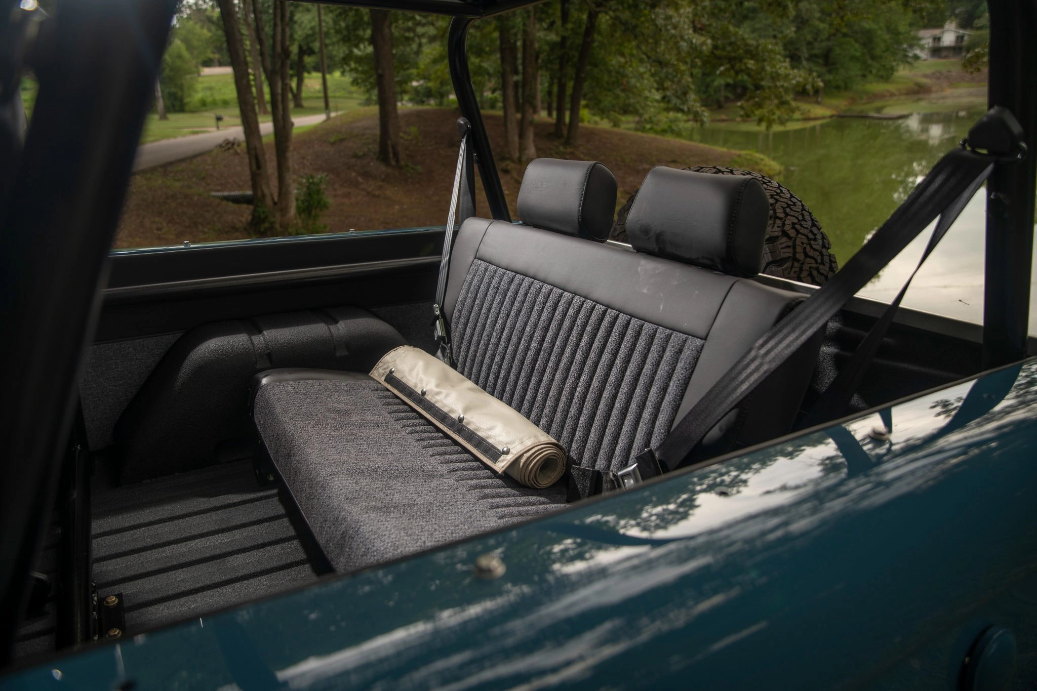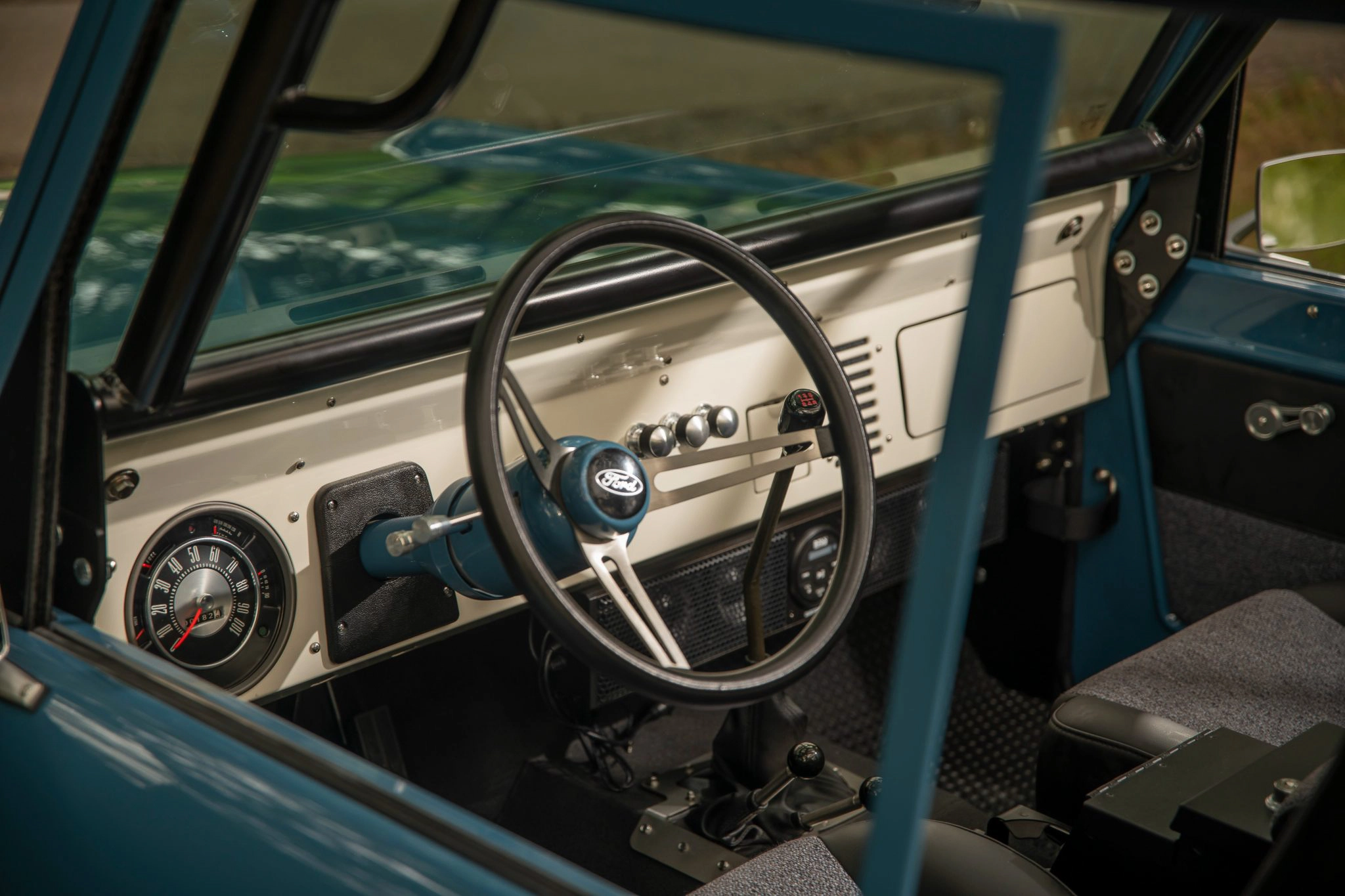 White-finished 15″ steel wheels are mounted with 31×10.50″ BFGoodrich All-Terrain T/A KO2 tires to give this Bronco a highly capable performance out on the open road. The truck is equipped with Wild Horses springs paired with Bilstein shocks, and a 1″ body lift has been installed. Power steering, power-assisted front disc brakes, and manually locking front hubs are additional elements and allow for a more modern driving experience.