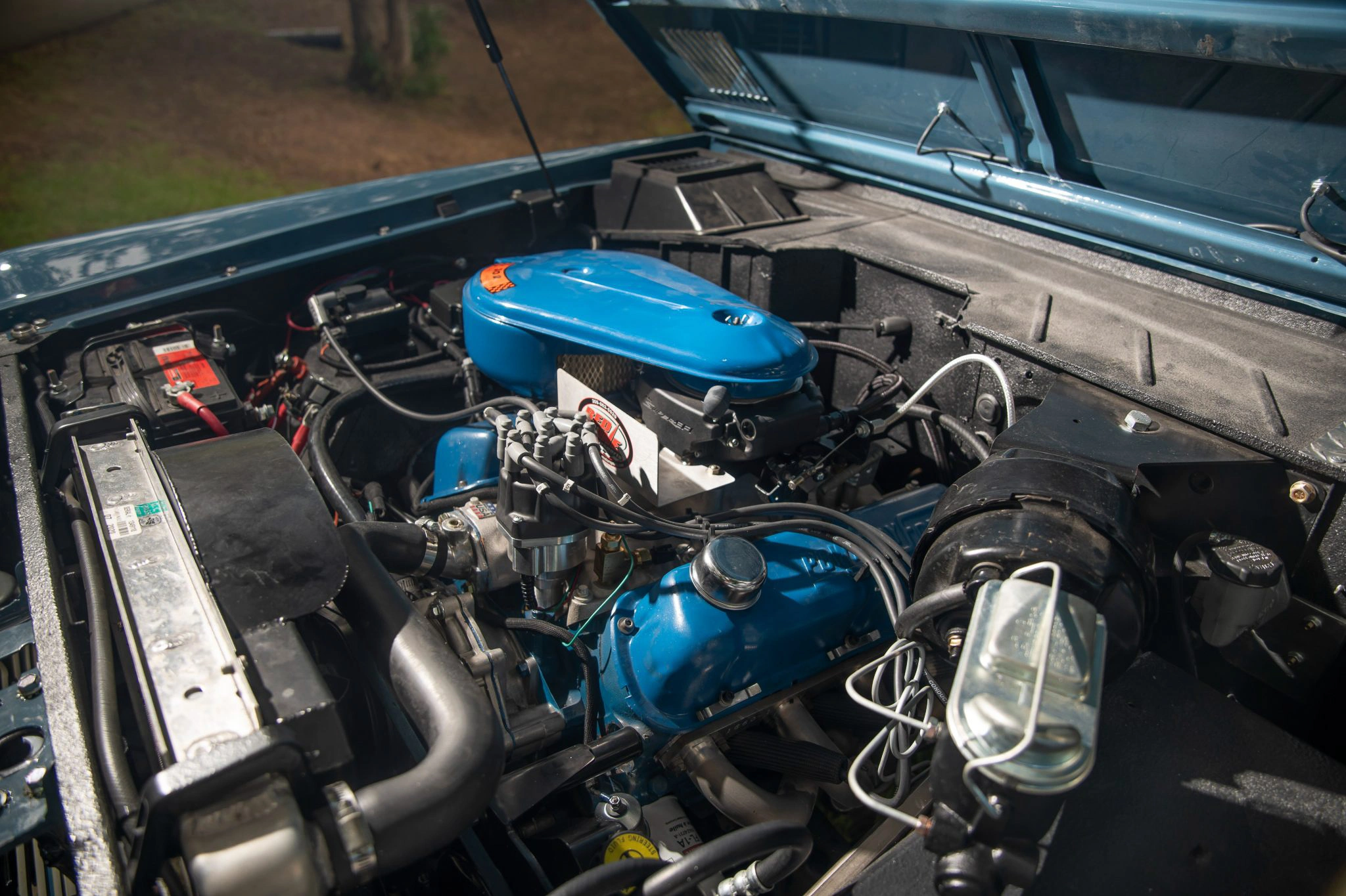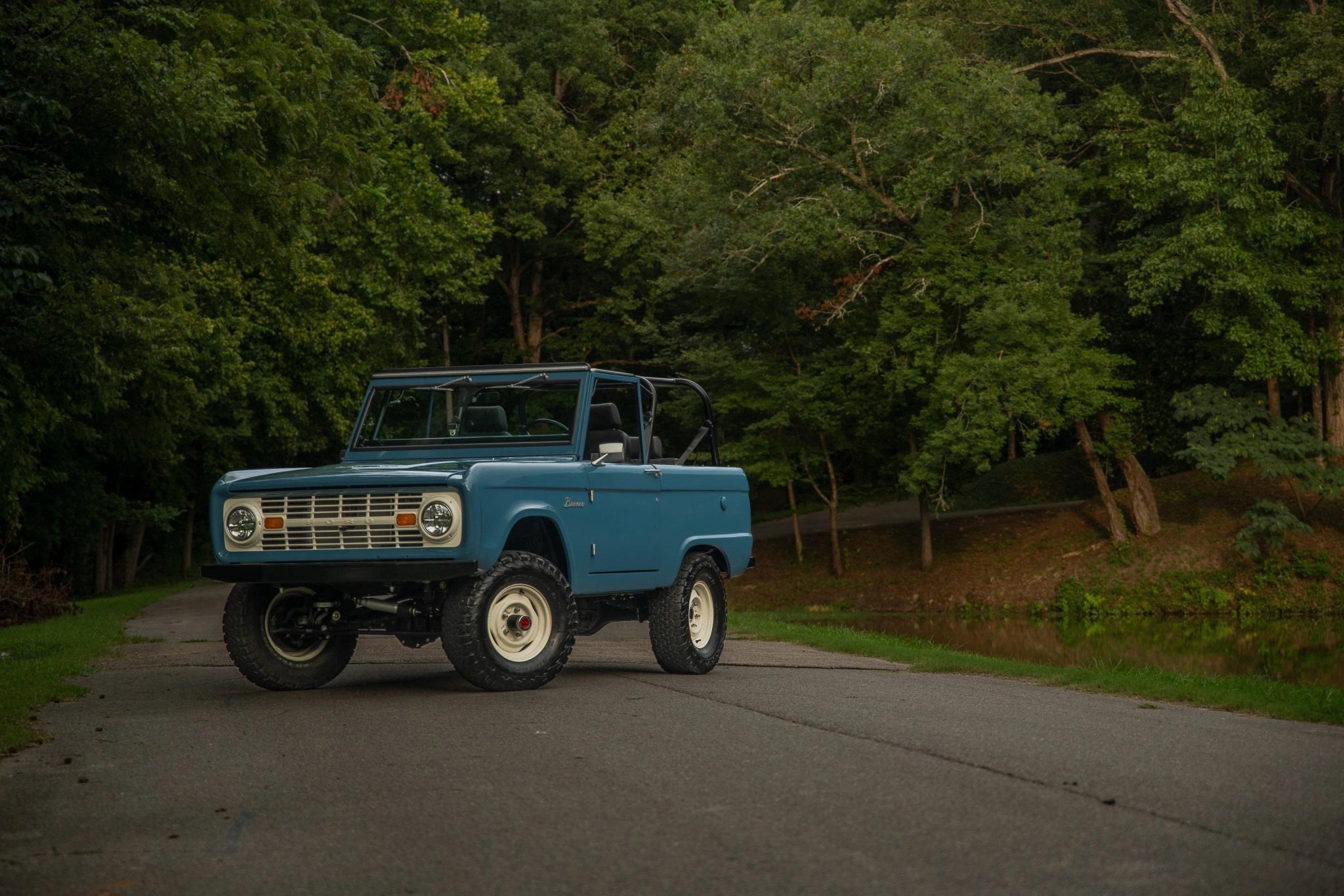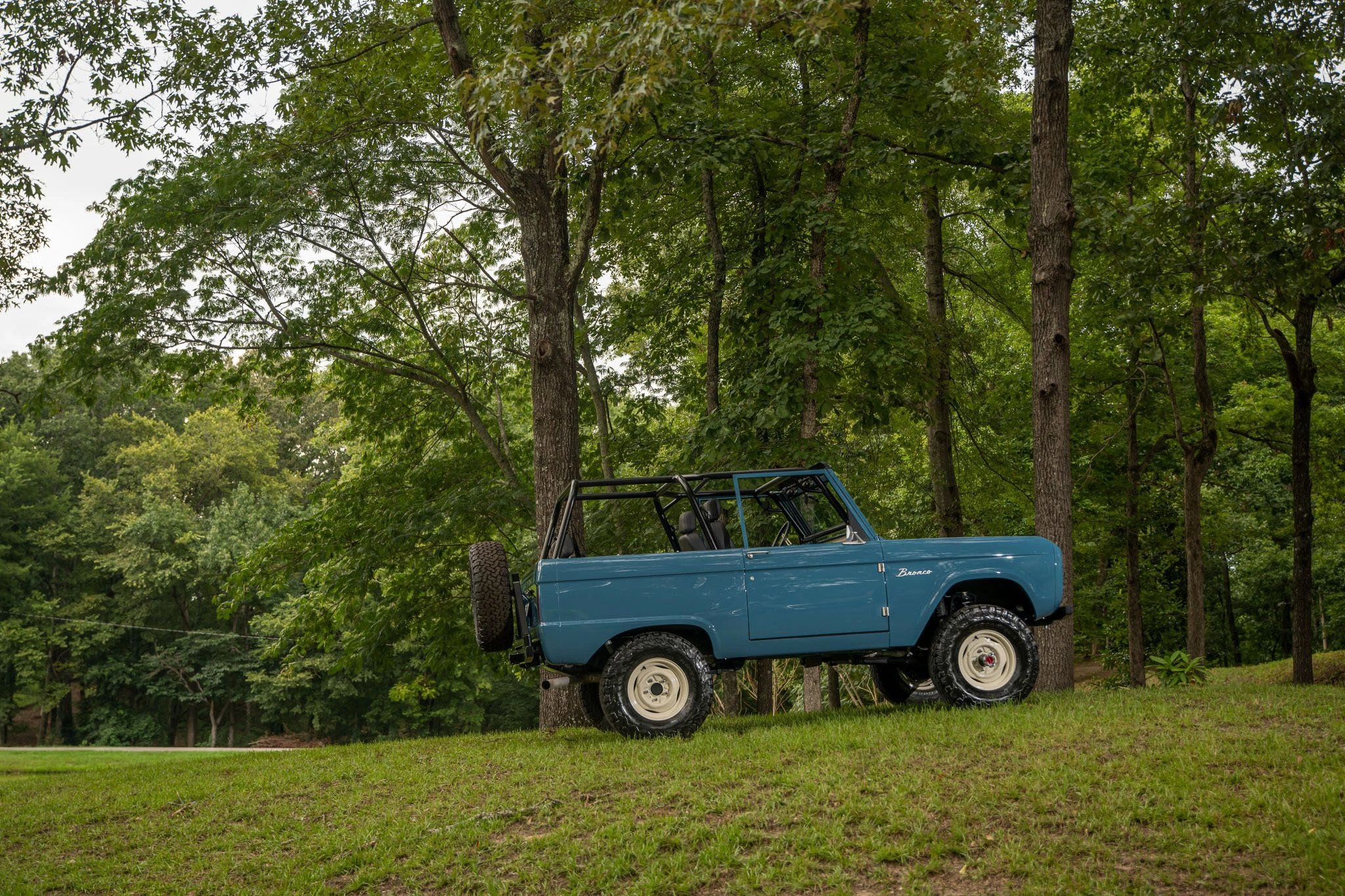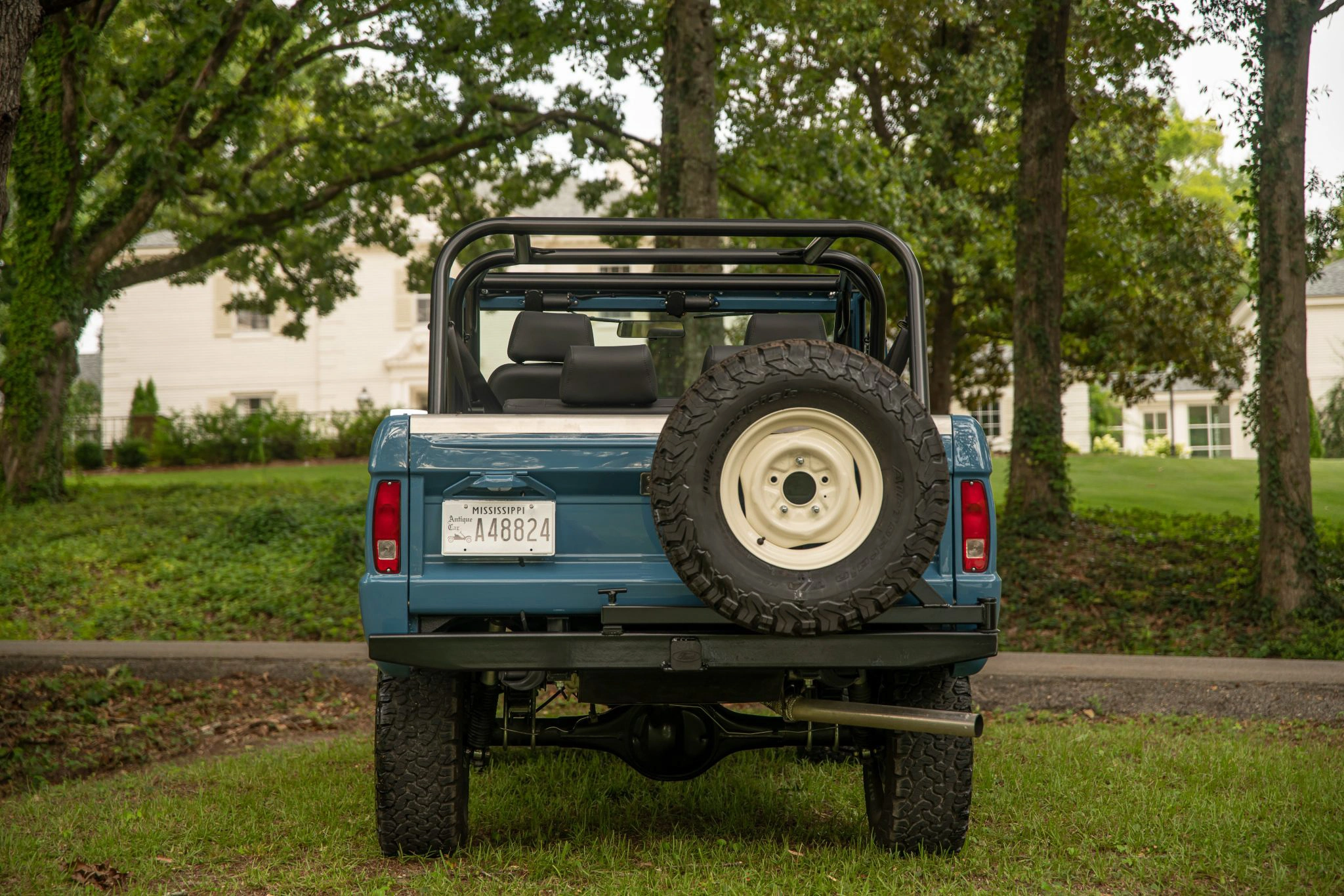 White-finished 15″ steel wheels are mounted with 31×10.50″ BFGoodrich All-Terrain T/A KO2 tires to give this Bronco a highly capable performance out on the open road. The truck is equipped with Wild Horses springs paired with Bilstein shocks, and a 1″ body lift has been installed. Power steering, power-assisted front disc brakes, and manually locking front hubs are additional elements and allow for a more modern driving experience.