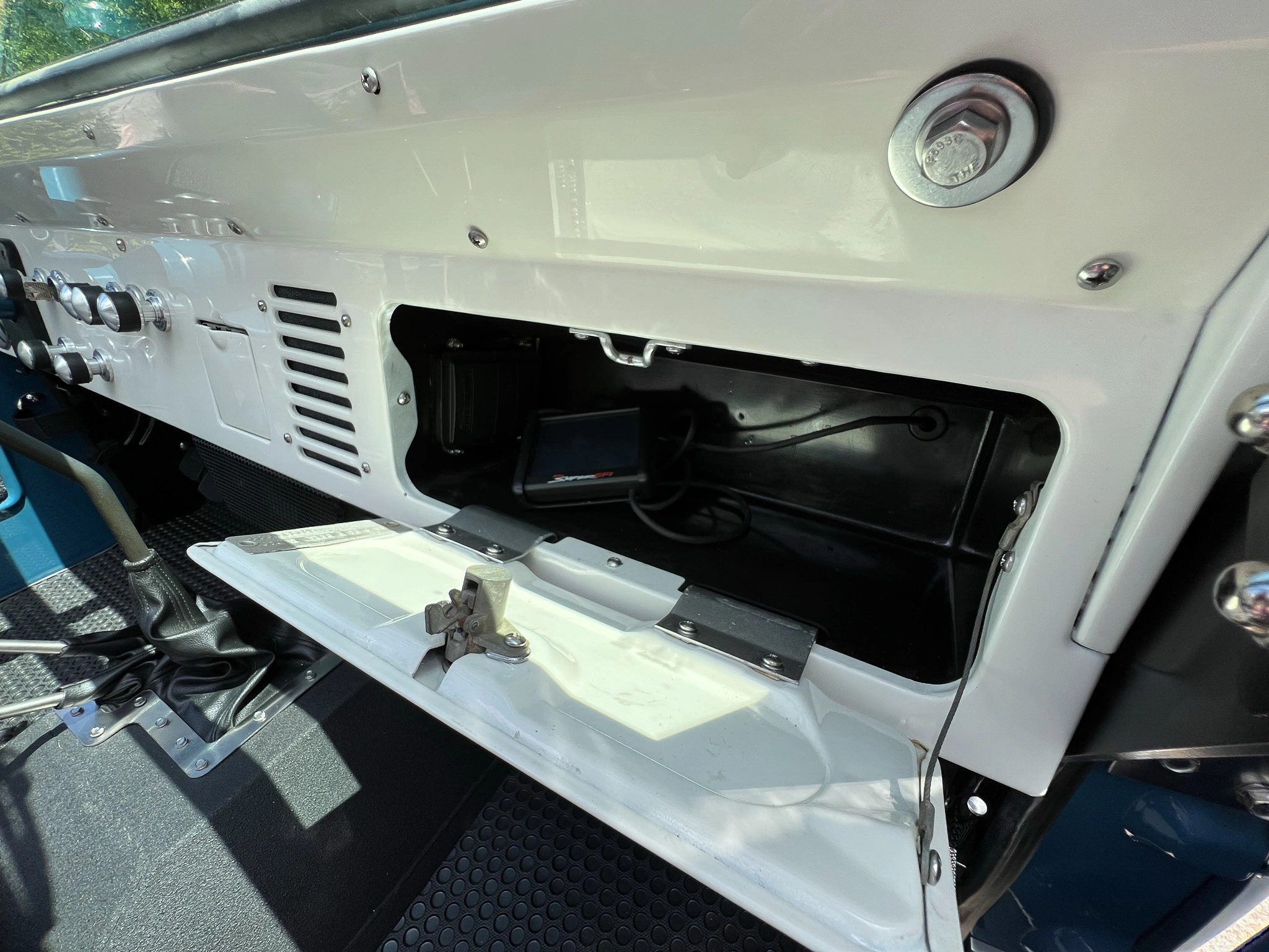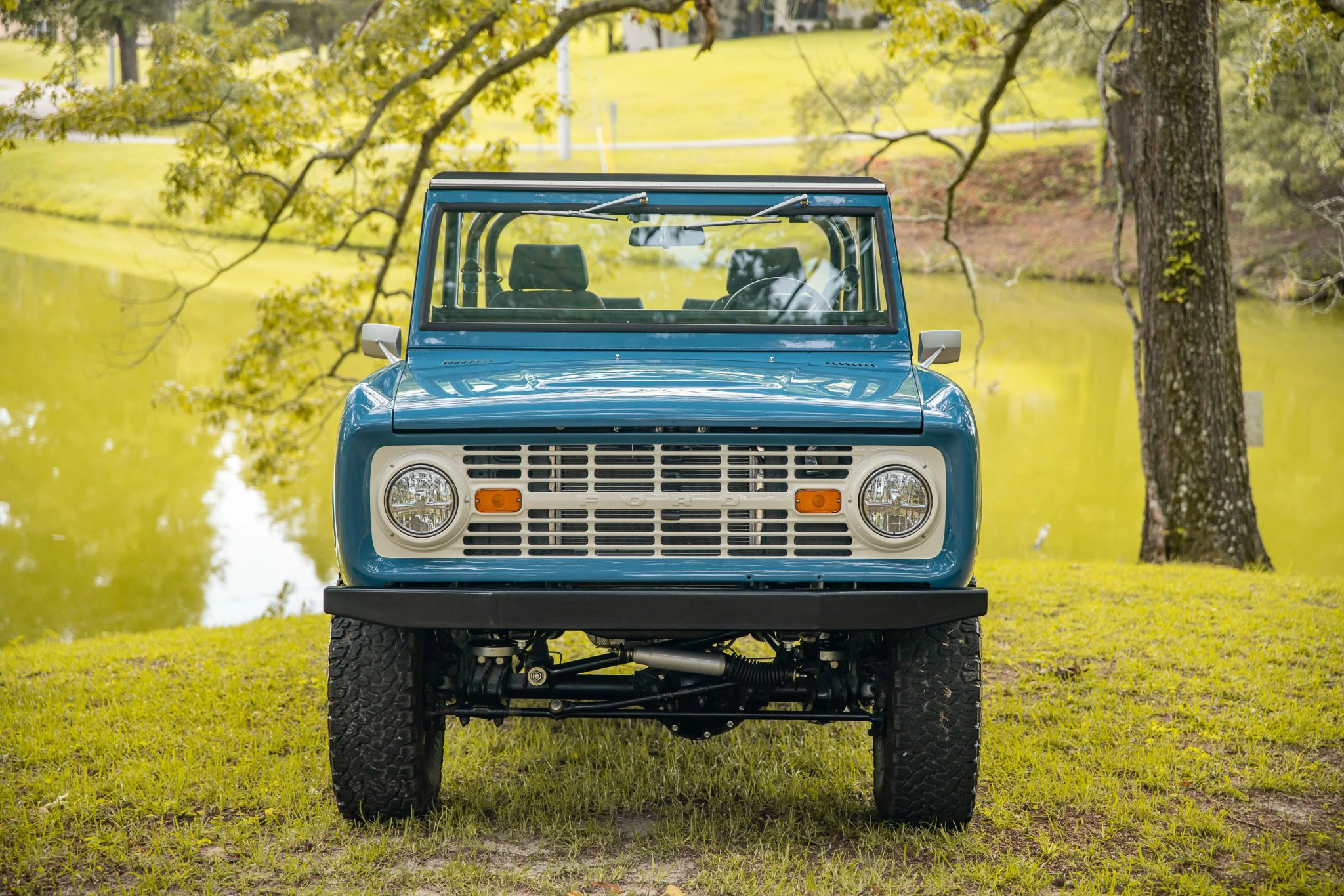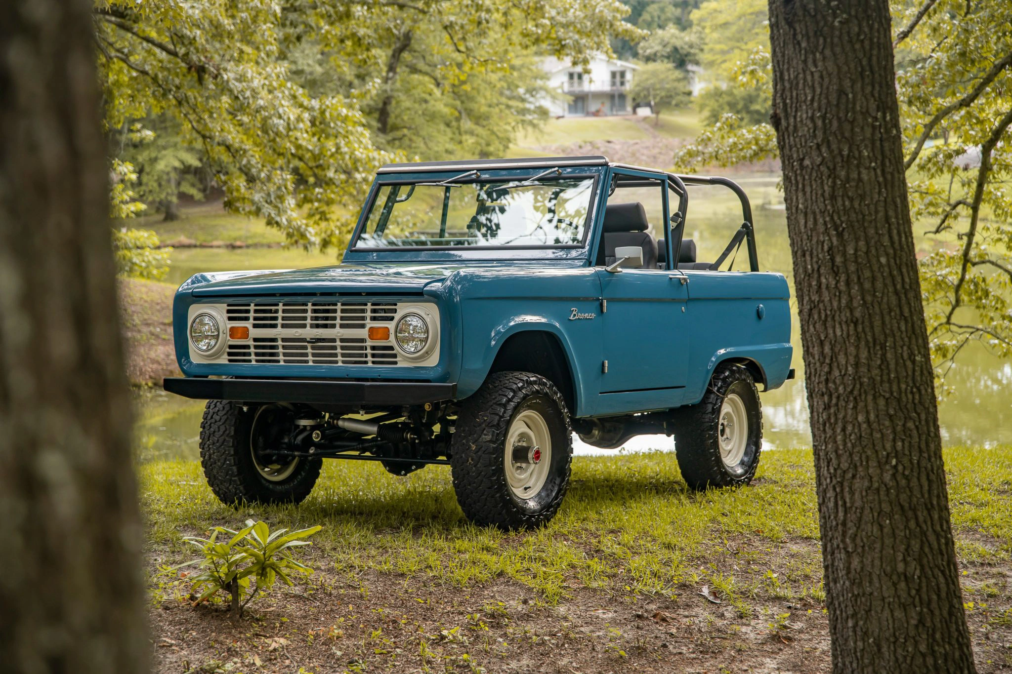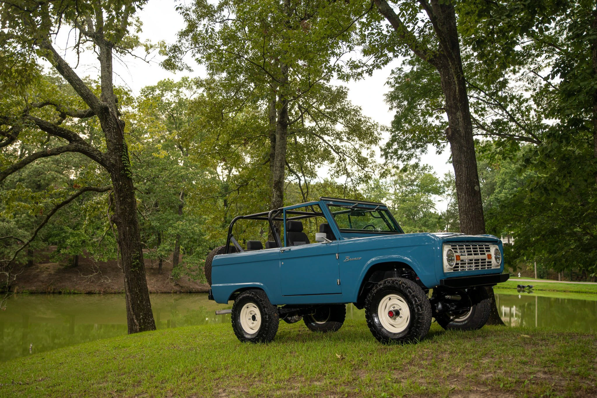 White-finished 15″ steel wheels are mounted with 31×10.50″ BFGoodrich All-Terrain T/A KO2 tires to give this Bronco a highly capable performance out on the open road. The truck is equipped with Wild Horses springs paired with Bilstein shocks, and a 1″ body lift has been installed. Power steering, power-assisted front disc brakes, and manually locking front hubs are additional elements and allow for a more modern driving experience.