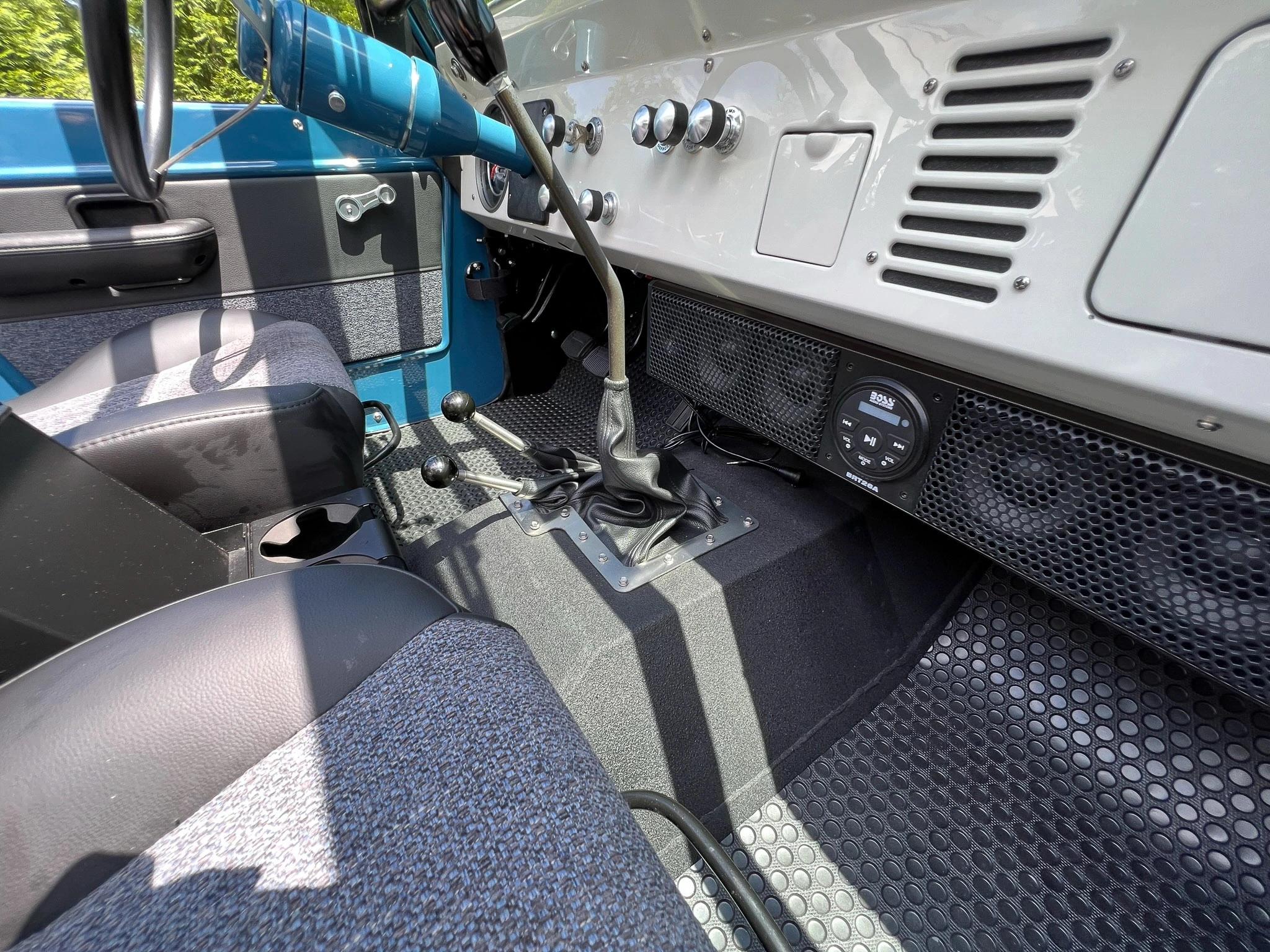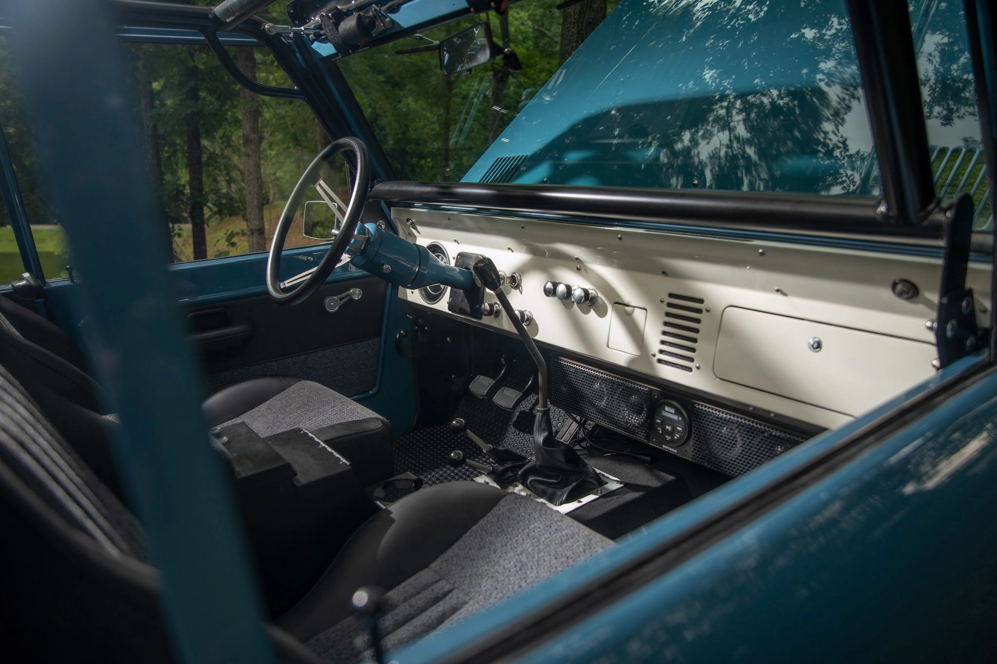 The high-back bucket seats and the rear bench are upholstered in black vinyl with grey cloth inserts and give car a classic aesthetic we’re loving here at The Coolector. The seats have been installed over a floor coated with spray-in bedliner. Appointments include a locking console box, three-point seatbelts, all-weather floor mats, and a rebuilt heating system as well as a six-speaker Boss sound system with USB, Bluetooth, and 3.5mm auxiliary connectivity. After a classy adventure machine from the 60s? This would be a top pick of ours.