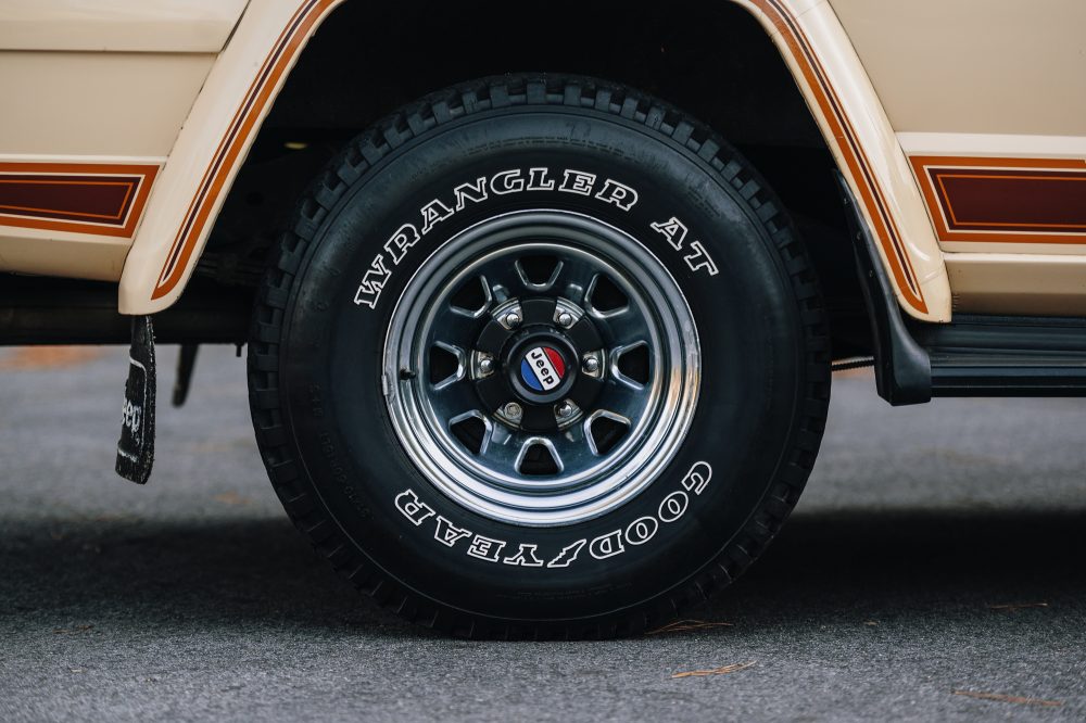 This is certainly one of the coolest looking Jeeps from the 80’s we’ve seen go under the hammer here at The Coolector and the Jamaican Beige paint is brilliantly complemented by tri-tone graphics and polished side mirrors. Some of the additional exterior equipment includes running boards, a bull bar with fog lights, a chrome roof rack, a rear receiver hitch, Jeep-branded mudflaps, and an electrically retractable rear window.