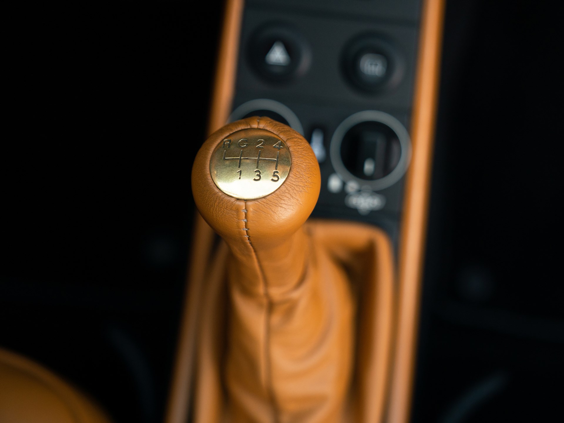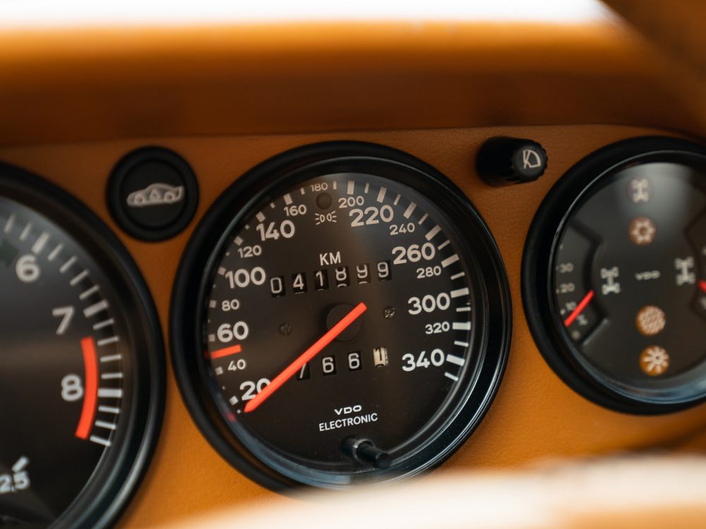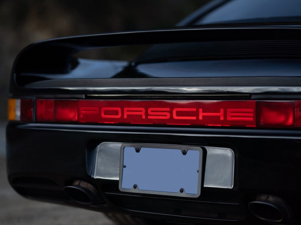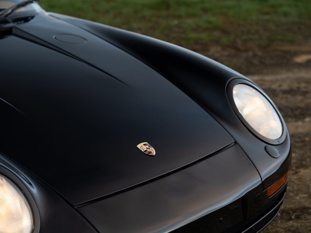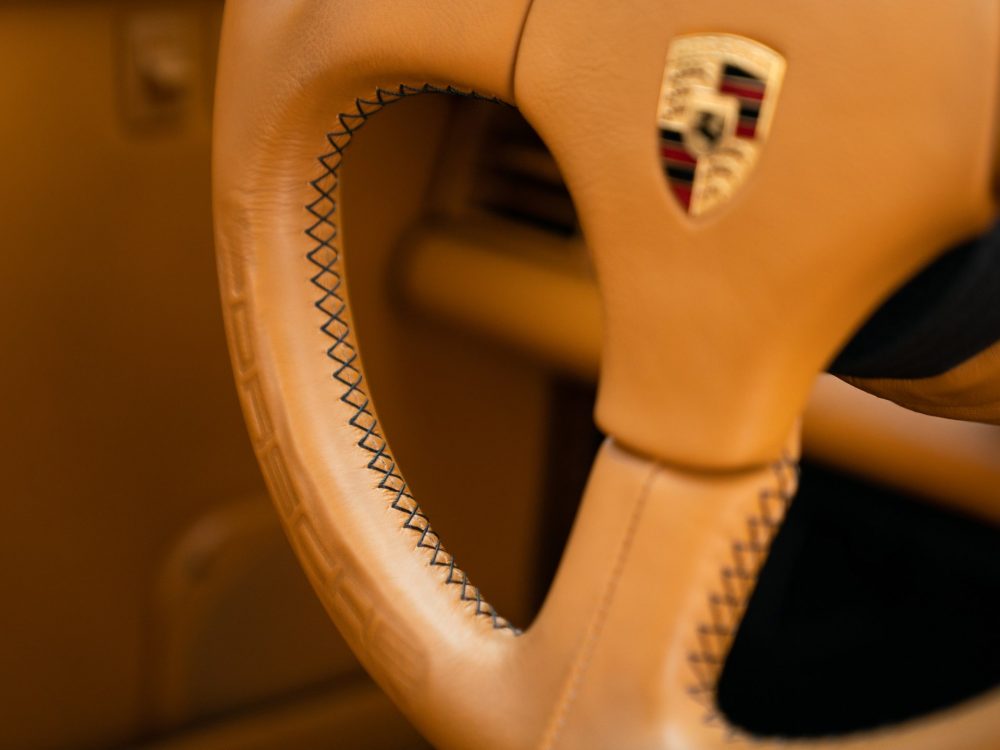 Flick wanted his car to be finished in black, leading it to become one of just three known examples originally finished in black, and upholstered in a voluptuous caramel brown leather interior. All three factory options were selected: sports seats with electric height adjustment, heated front seats, and an alarm system. In addition, the car was fitted with an Exclusive option CDR-210 radio and a special steering wheel embossed with the Porsche crest. All interior surfaces were covered in leather, including even the air vents and the electronic window switches, and black carpeting was fitted matching black stitching on the steering wheel and seats.