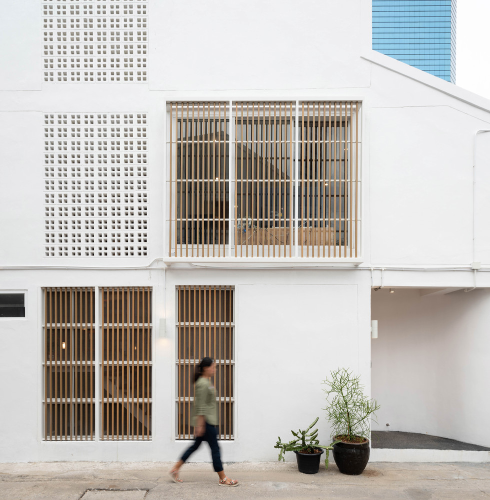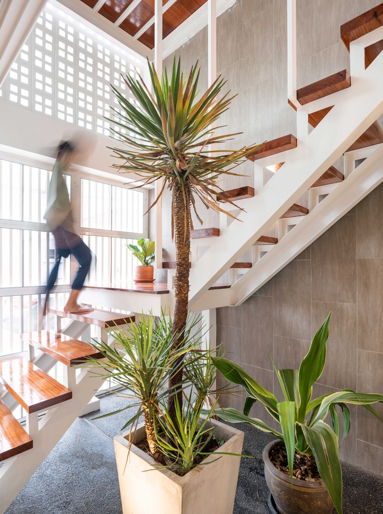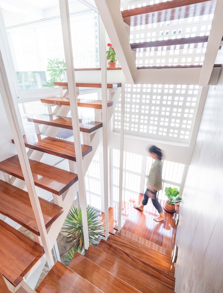 It’s clear that the stairway of this existing townhouse in Bangkok has an important role to play in its overall functionality and is more than just a circulation point for the property. It is the core of the project as it brings natural light and ventilation to the whole building. This vertical space has been completely transformed from a classic indoor circulation to a semi-outdoor space in connection with its tropical environment. Concrete blocks and wooden screens provide privacy to the residents while delivering natural daylight into each floor and allows natural ventilation to flow along.