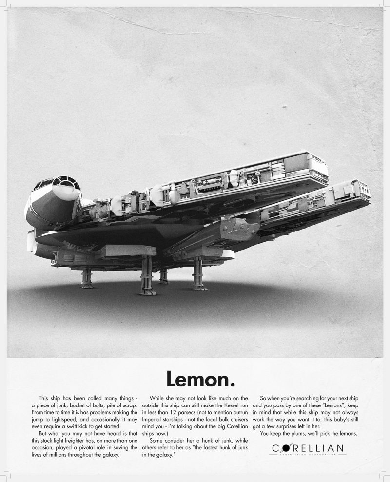 The Lemon advert from Volkswagen helped turn the advertising industry on its head and that’s the fact that is being celebrated here with this fantastic collection of prints from 2046 Design that incorporates the likes of the Delorean from Back to the Future, Ewoks, R2-D2 and the Firefly space craft and for fans of any of these franchises and indeed advertising in general, this will serve as the ideal piece of artwork.