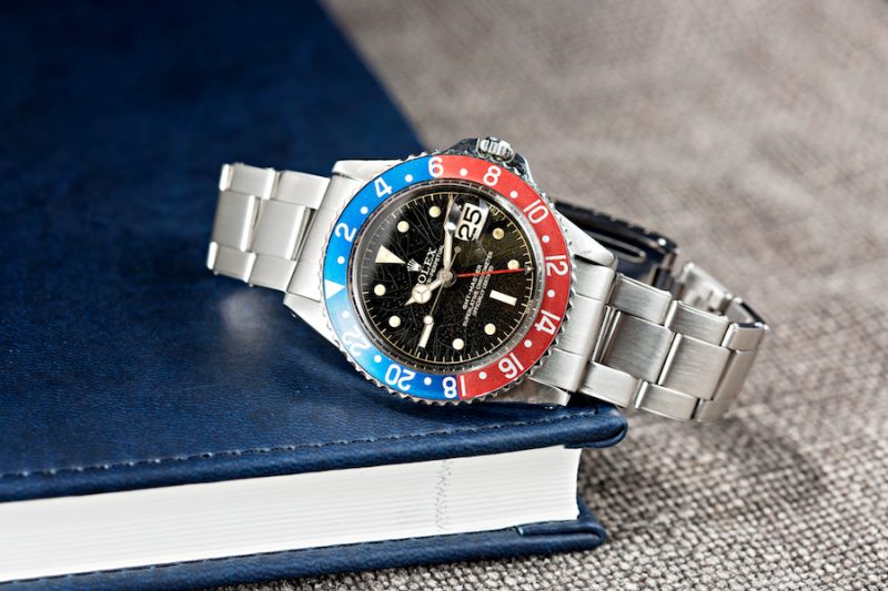 Produced for over 20 years, this GMT – Master isn’t just relatively easy to find when it comes to vintage Rolex watches, it’s also available in a variety of options. For example, earlier references featured a 24-hour hand topped with a small GMT hand which helps indicate the 24-hour day, while later references displayed a larger 24-hour hand topped with a large triangle. Depending on the year the ref. 1675 was produced, the GMT Master can also be found with either pointed or rounded crown guards, with or without a chapter ring, a Jubilee or Oyster bracelet, and with either a black or a more distinct red and blue “Pepsi” bezel.
