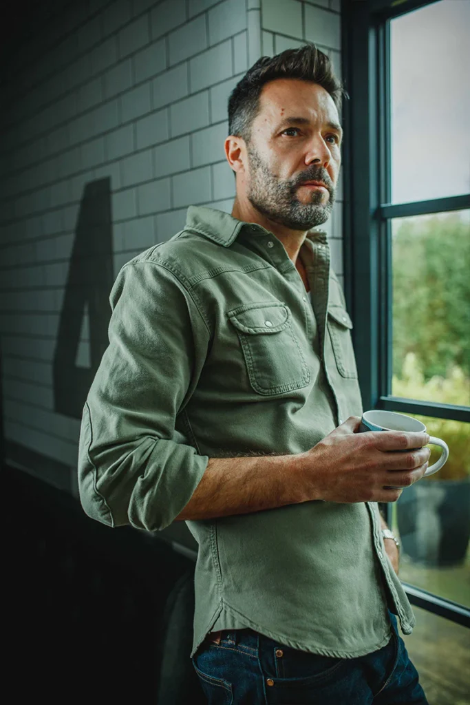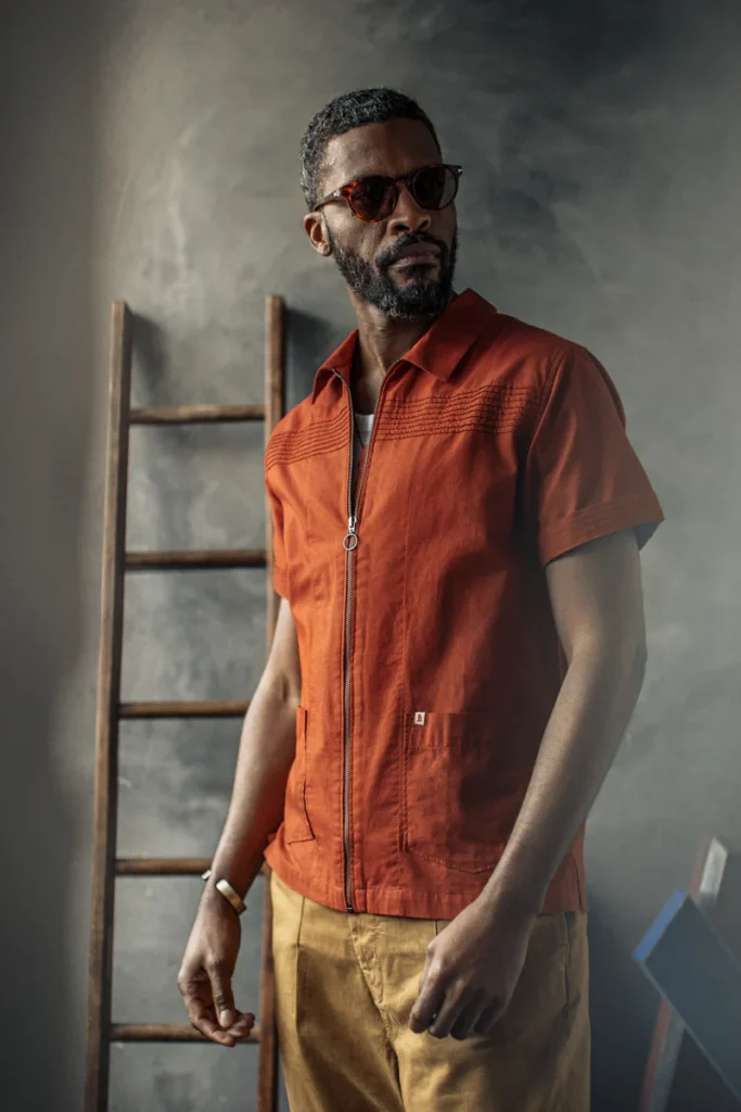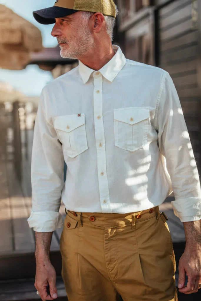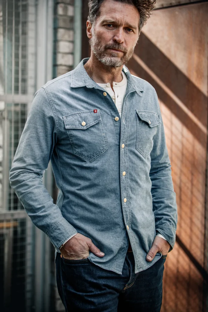 The Emerson Shirt showcases a distinguished Grandad collar, echoing styles from a past era. It’s crafted with chambray trim fabric and features front yoke detailing with a laid-on placket, giving it a rugged appeal. The addition of a concealed lower placket and buttons infuses the shirt with a refined sophistication.