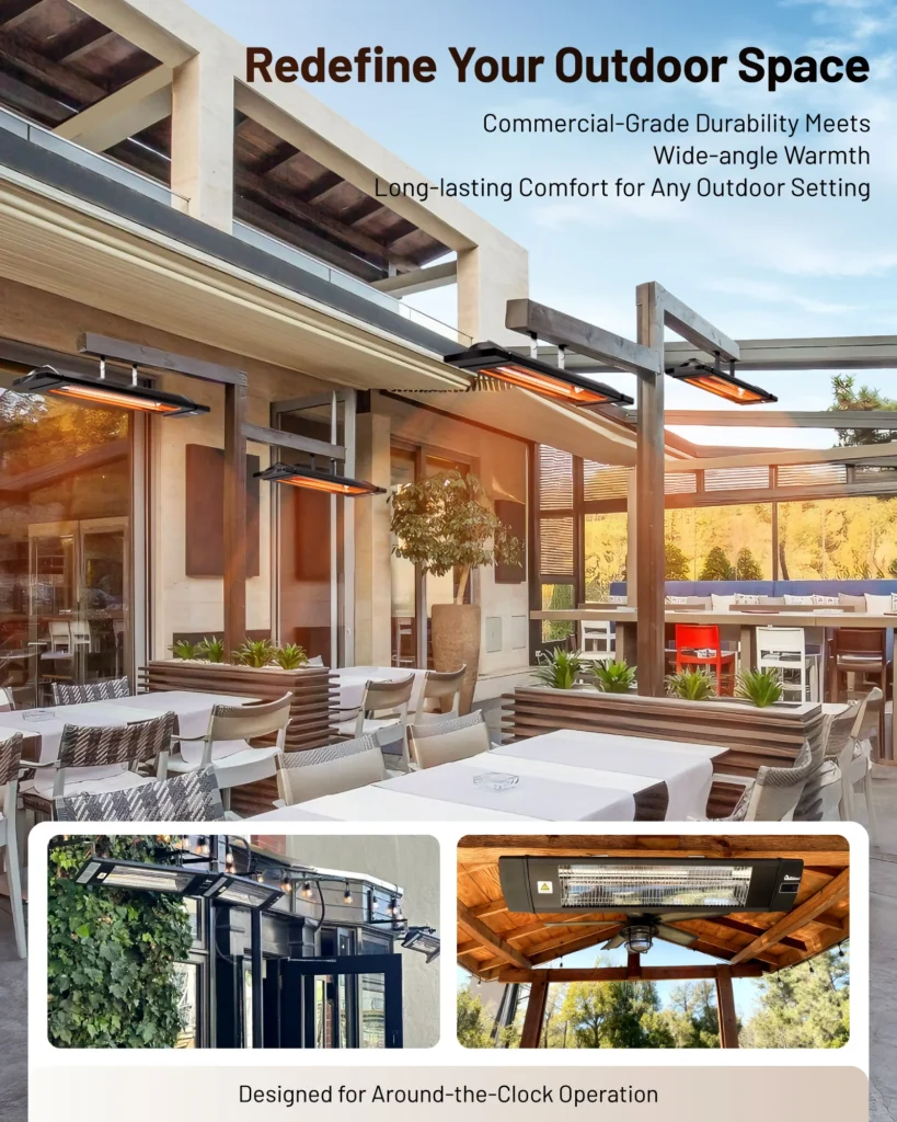 For versatility in a garage, enclosed lanai, or open deck, the Dr. Infrared Heater DR-238 ($139) is a powerhouse. Using carbon infrared technology, it delivers heat instantly upon activation. What sets this model apart is its flexibility; it is rated for both indoor and outdoor use (IP55 water resistant), making it perfect for transition spaces.