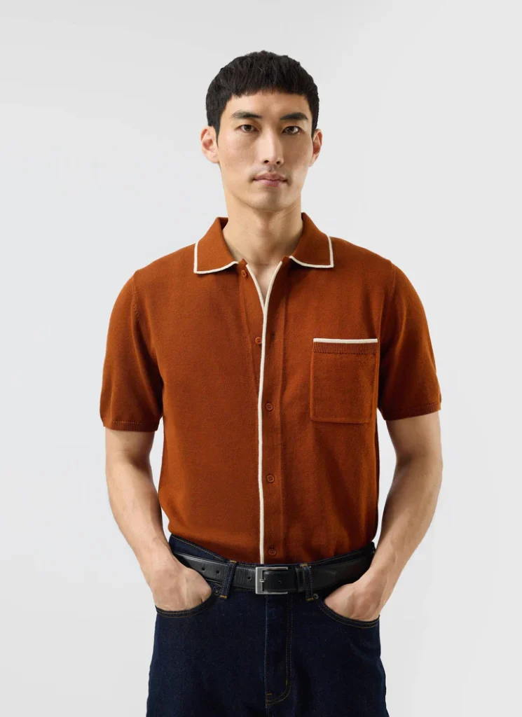Crafted in an earth rust red, this men’s knitted shirt blends timeless style with summer-ready comfort. Made from a lightweight, breathable wool blend. Featuring short ribbed sleeves, a classic button-down front featuring custom Percival buttons and practical chest pocket, it’s a versatile staple for any wardrobe.