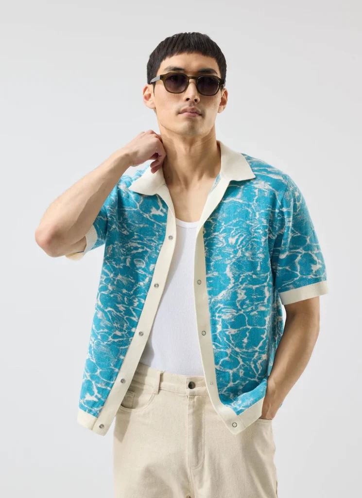 Men’s open collar knitted shirt, made from a breathable cotton for all-day comfort. This ocean patterned bowling shirt features a retro inspired square design and stylish snap buttons, allowing it to be worn open or closed.