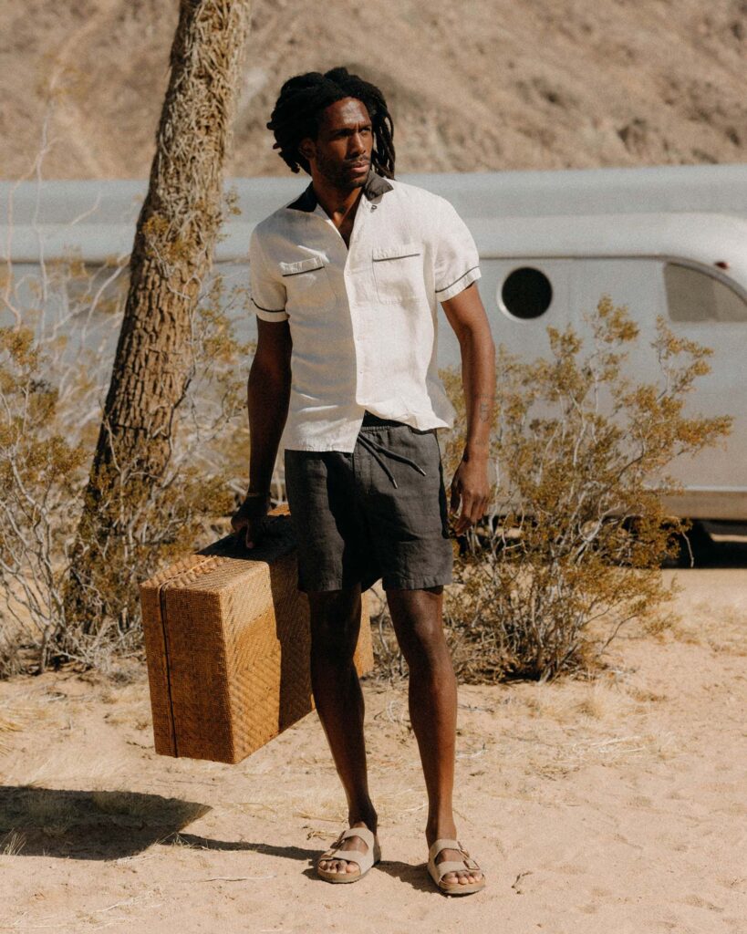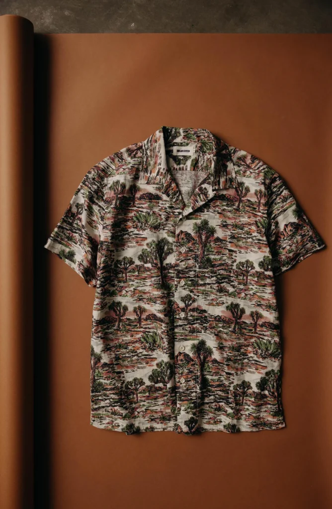 Designed in collaboration with Jimmy Thompson of Jim & Juice, The Davis Shirt features a custom Desert Palm print inspired by the wide-open horizons of California’s high desert. With its camp collar silhouette and breezy linen blend make, this one’s built to bring some standout character to your summer rotation.