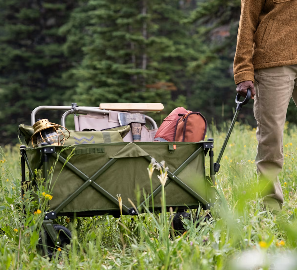 - A collapsible wagon made with a sturdy metal frame that folds up in seconds